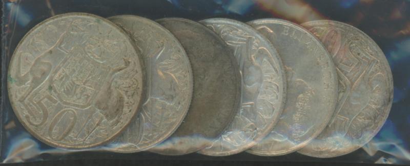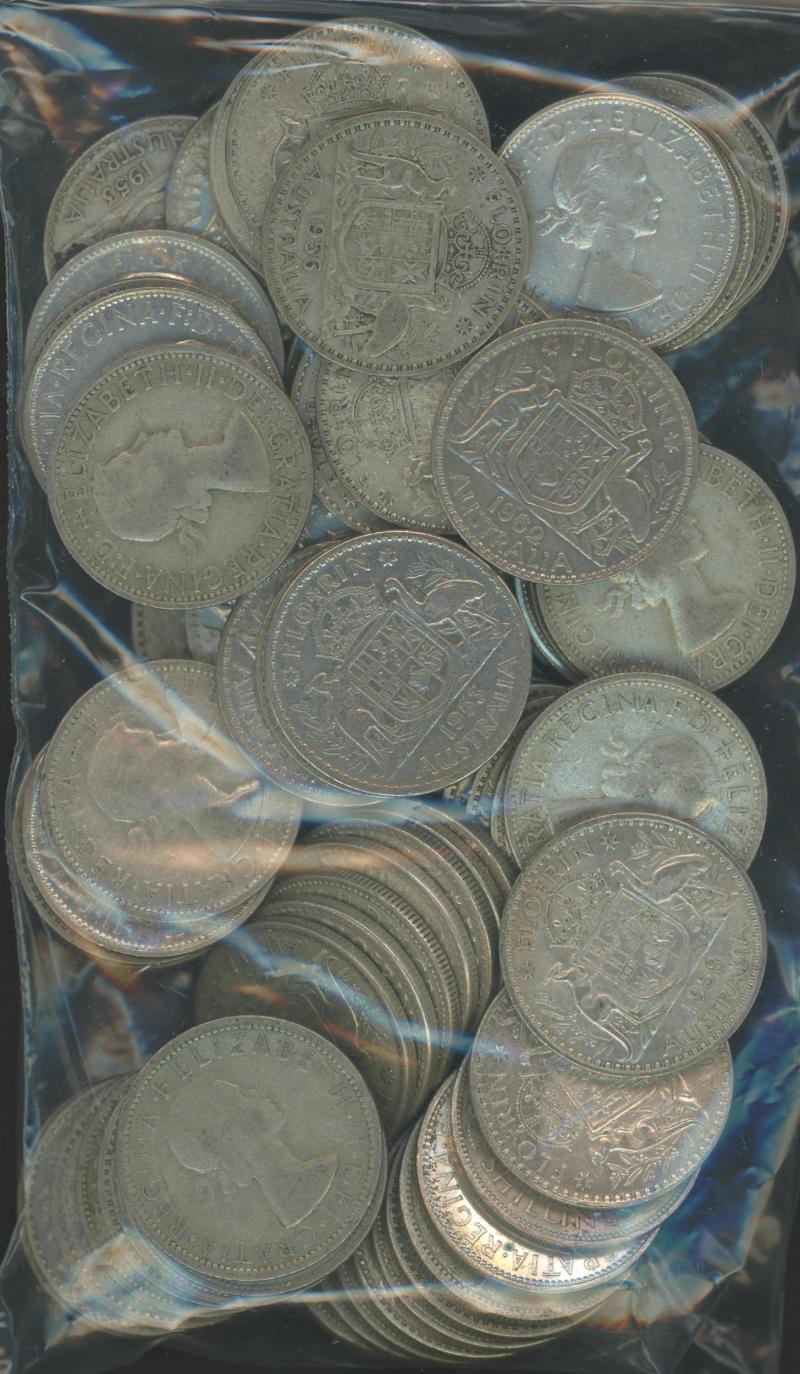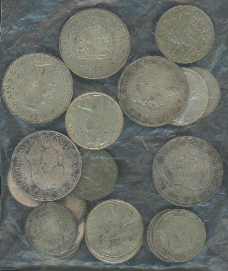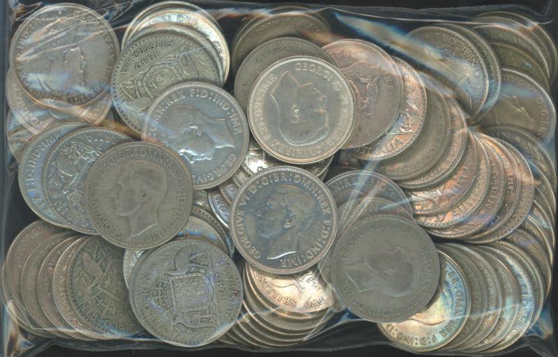 Silver KGV-QEII with 3d (0.11kg); 6d (0.23kg); Florin x9; Crown KGVI 1937 x5; 1966 50c x6, condition variable.