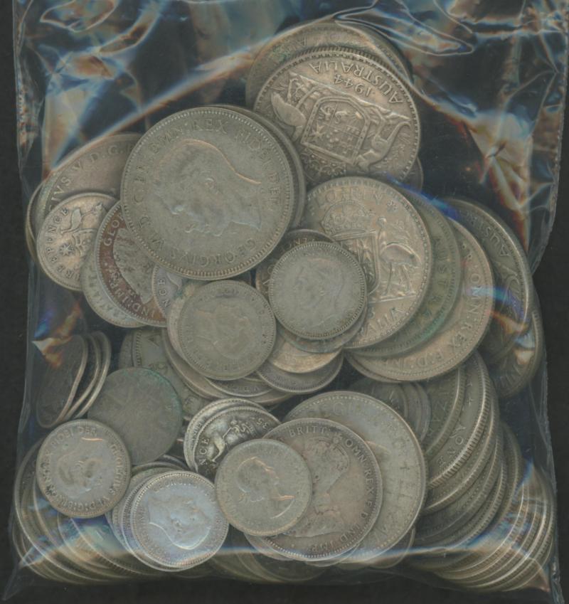 Silver KEVII-QEII 3d to 2/- in bag (total 0.75kg) with 6d x109, 1910 3d x8 in bracelet; plus 1966 50c x6; condition variable.