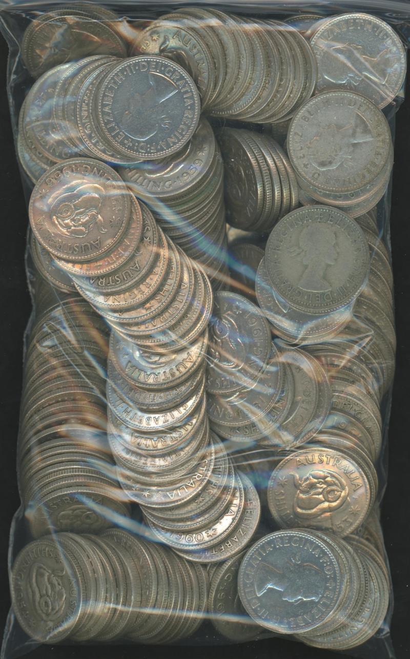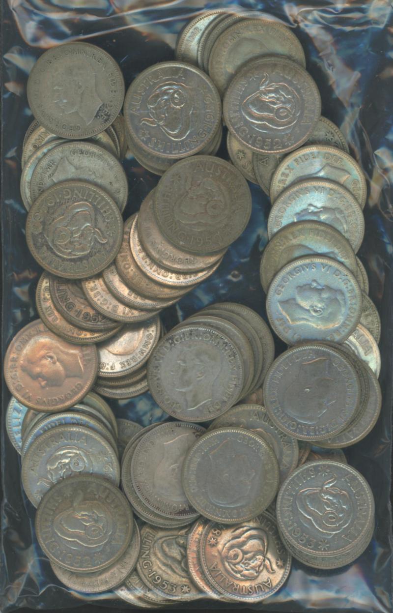 Shilling: 1/- KGVI and QEII in bag, weighs 1.69kg, some polished, condition variable