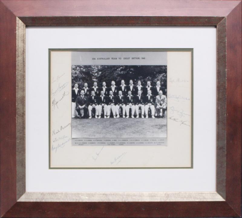 Barnes, Ron Saggers, Lindsay Hassett, Neil Harvey, Don Tallon, Ray Lindwall, Ian Johnson, Keith Miller, Bill Johnston, Bill Brown & Arthur Morris, window mounted, framed & glazed, overall 51x46cm. (Image1)