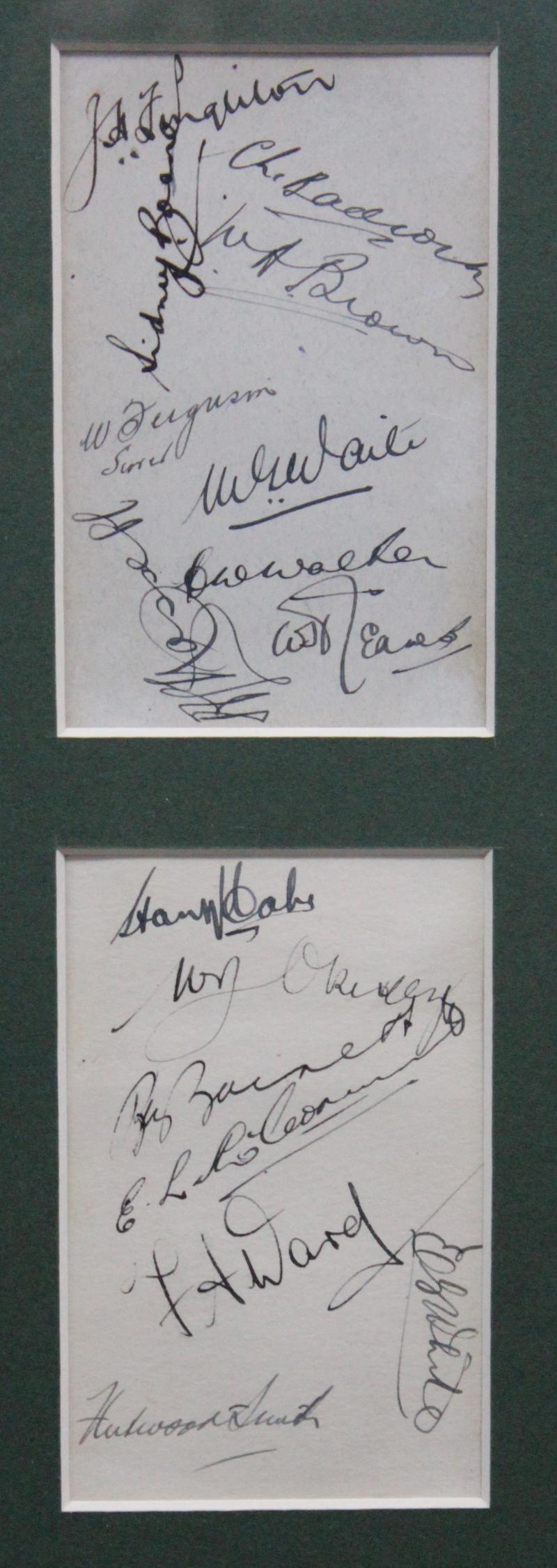 Ian Johnson, Bill Johnston, Ray Lindwall, Sam Loxton, Colin McCool, Keith Miller, Arthur Morris, Doug Ring, Ron Saggers, Don Tallon, Ernie Toshack & Keith Johnson (manager); plus the hand-stamp of Sid Barnes (couple of signatures fading), window