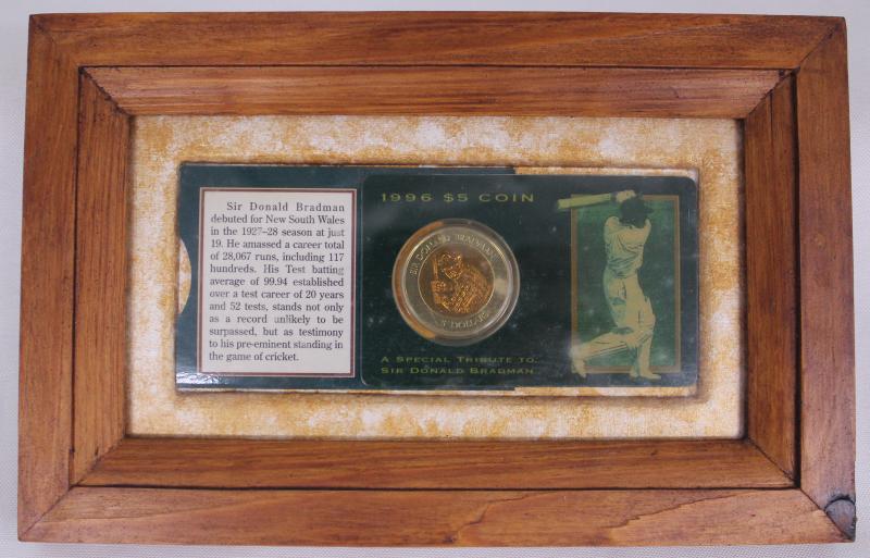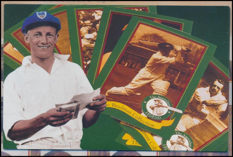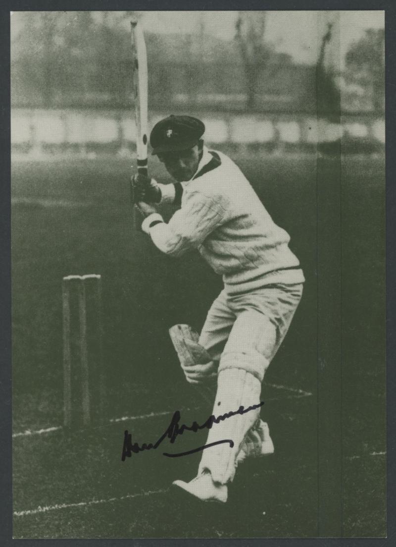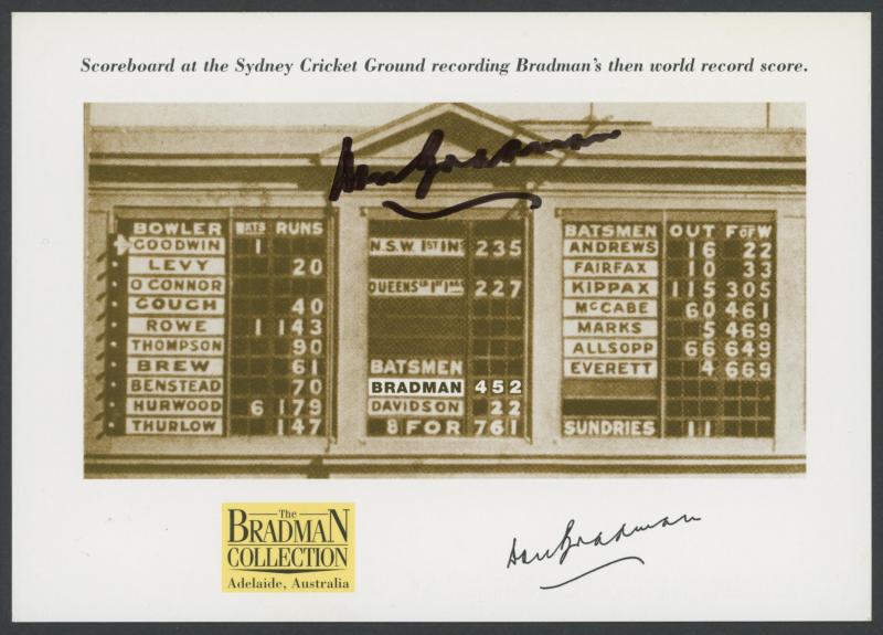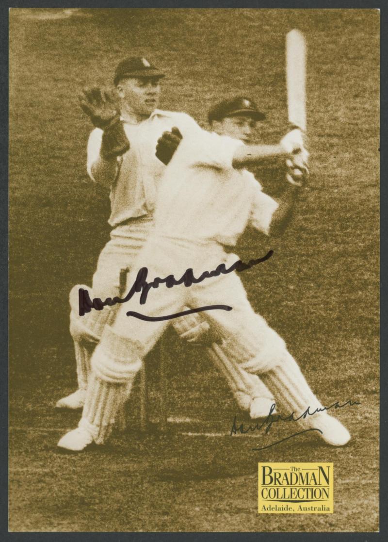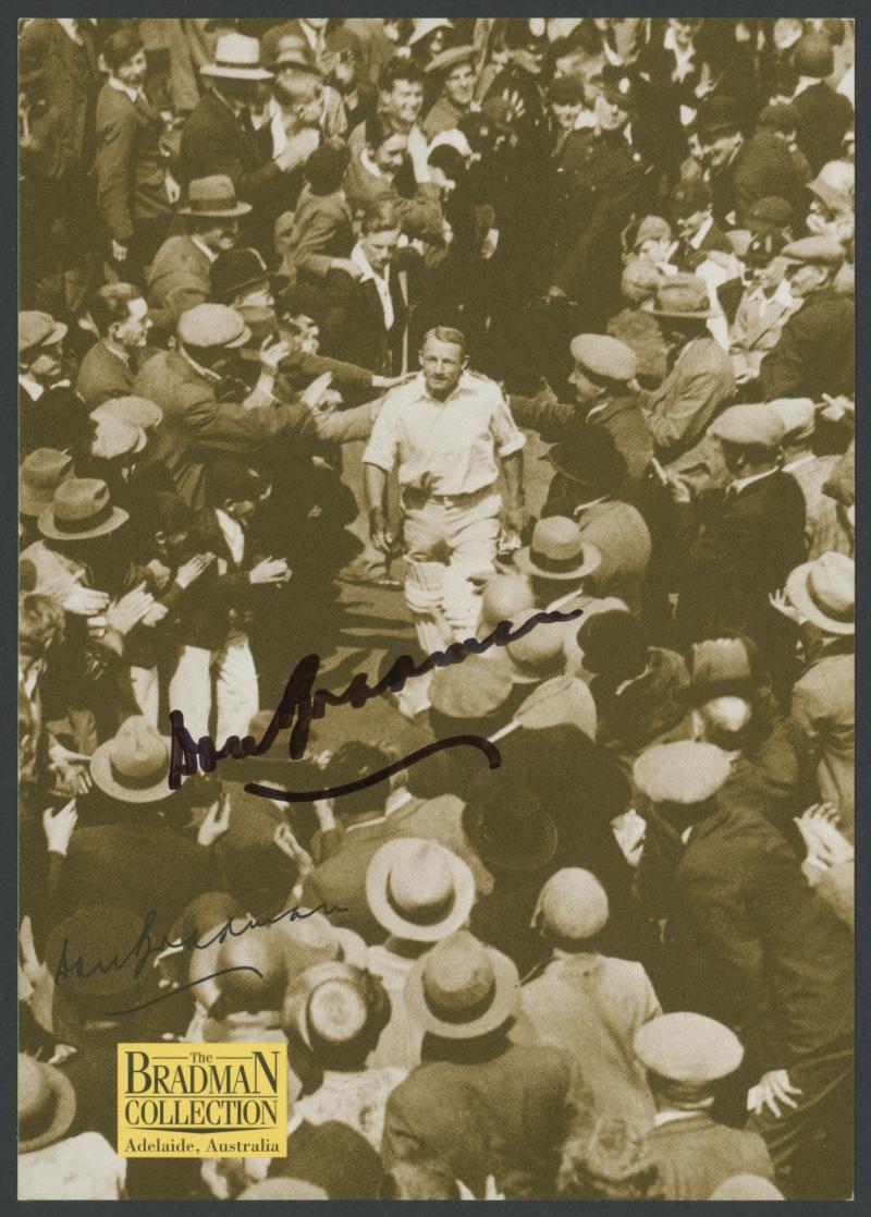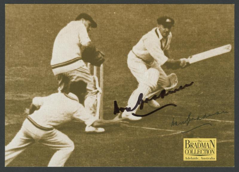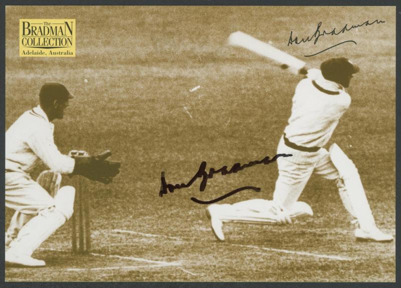 Don Bradman card signed), framed & glazed, overall 36x55cm, Fine condition. (Image1) (Image2)