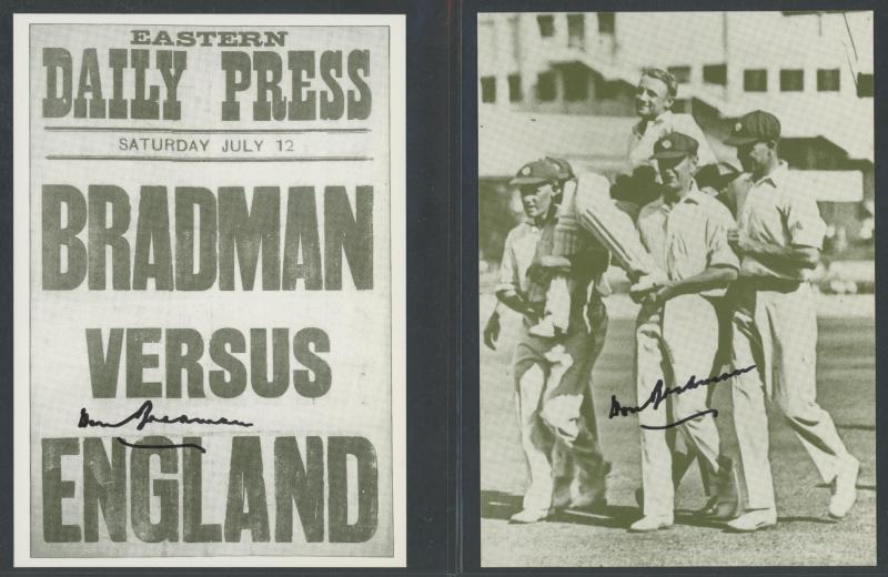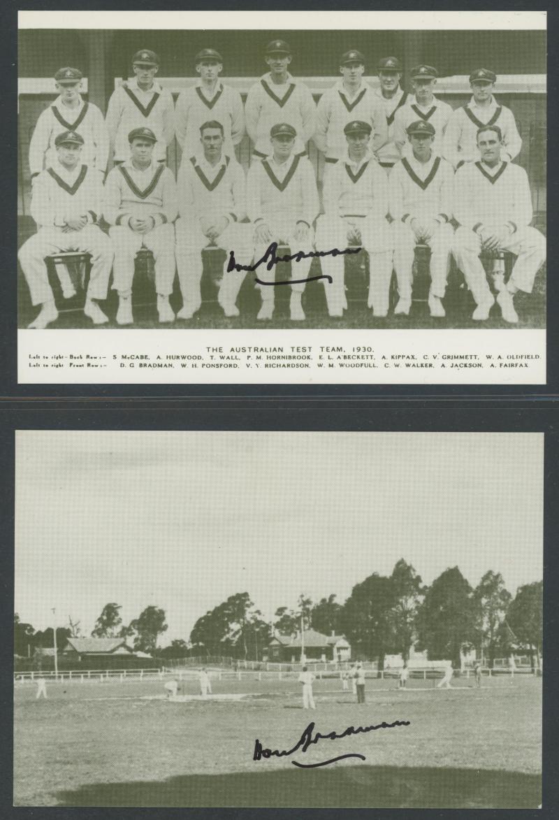 DON BRADMAN: Post-Age 'Bradman Advertising Postcards' Elasta-Strap & 'Go out to AUSTRALIA for the Test Matches', both signed by Don