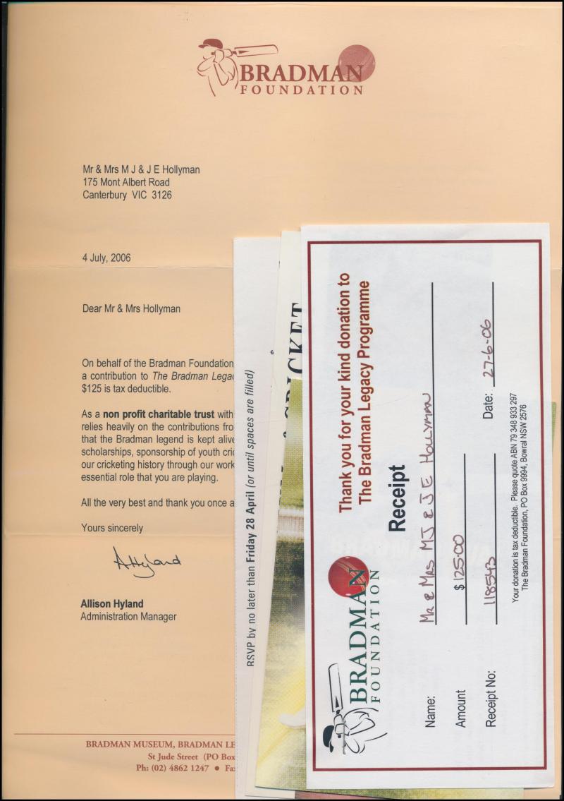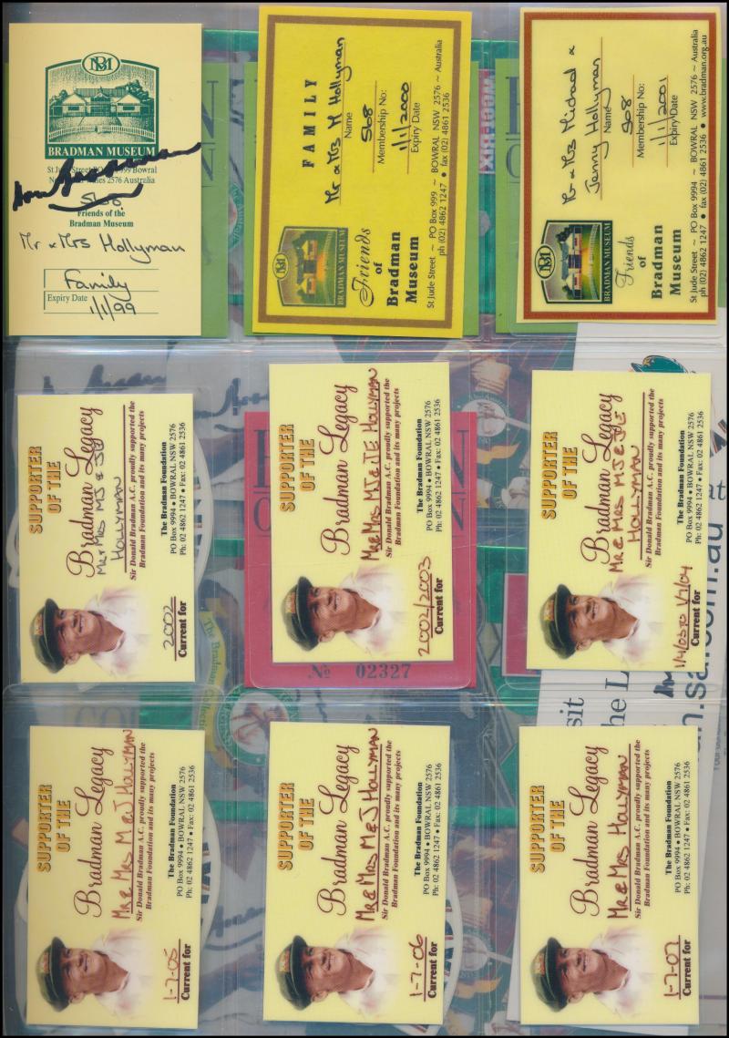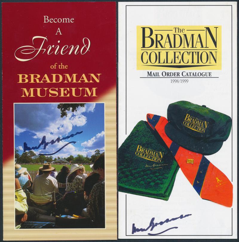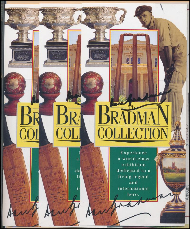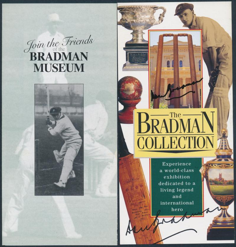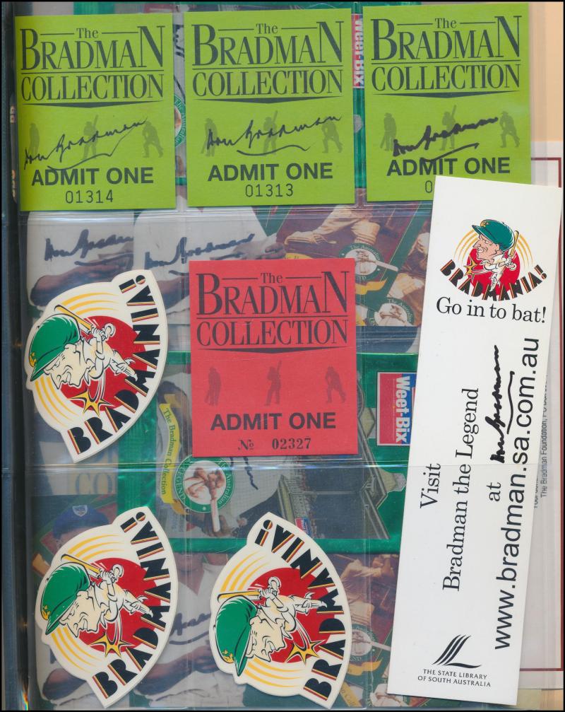 brochures (14 - 4 signed) & packets (2 - both signed); Bradman Museum/Foundation membership tickets (9) one signed; Bradman Collection tickets (4 - 3 signed); Bradmania stickers (3) & signed bookmark; 1997 Australian Legends - Don Bradman FDC signed;