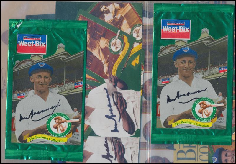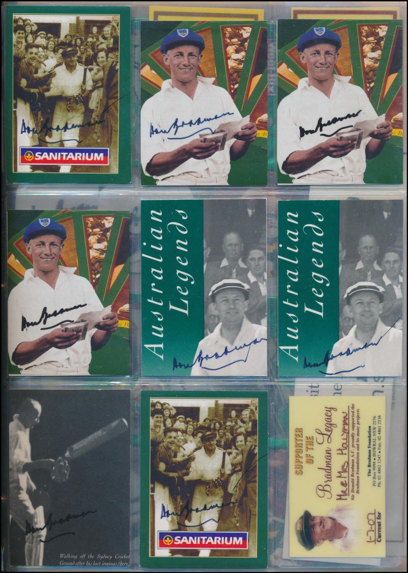 DON BRADMAN: Ephemera collection in album, comprising publicity pictures (8) all signed; 1995 Sanitarium 'The Bradman Collection'