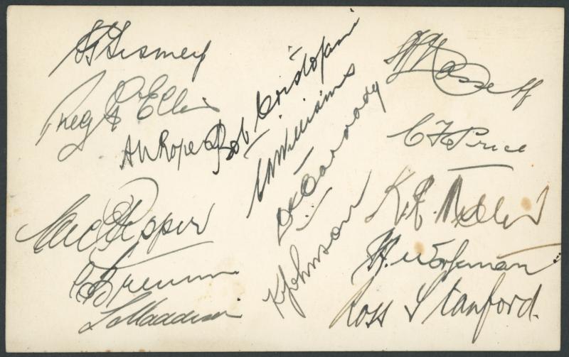 1945 Australian Services XI Postcard-size photograph with 15 signatures on reverse including Lindsay Hassett, Keith Miller, Stan