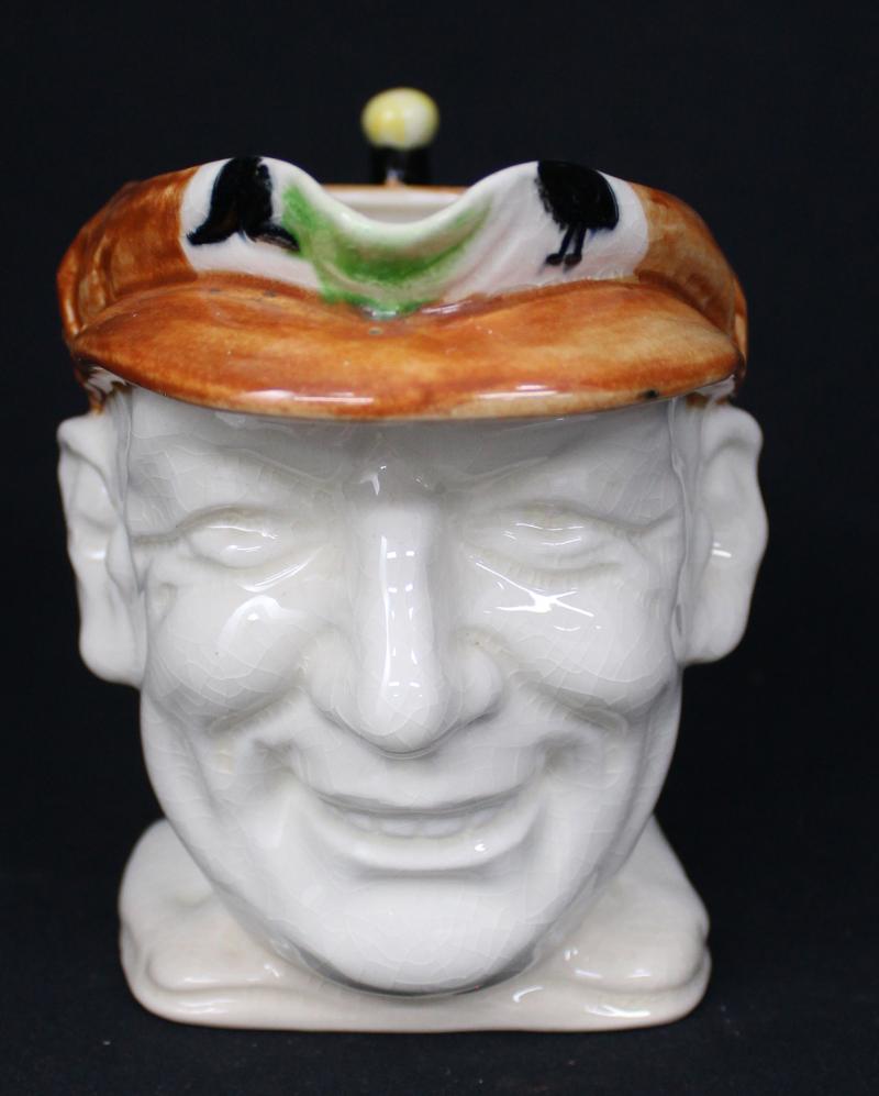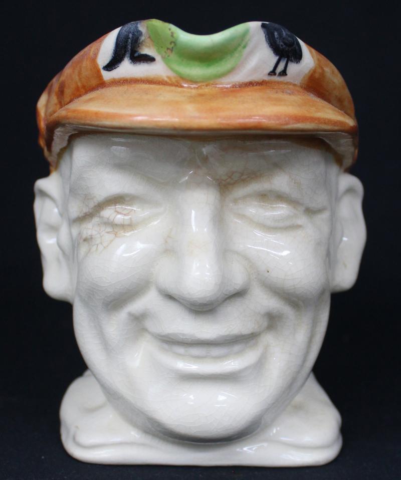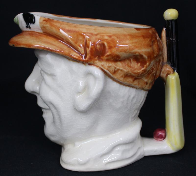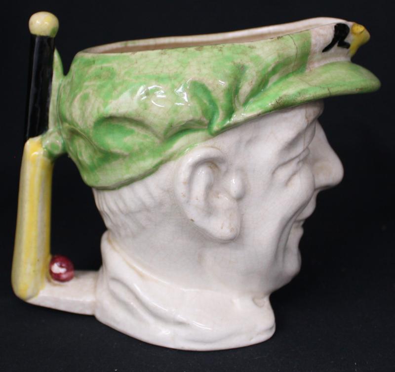 DON BRADMAN: 1934 large toby jug with cap in green, made in Japan by Marutomo, 15cm high, Fair/Fine condition (small cracks). (Image1) (Image2)