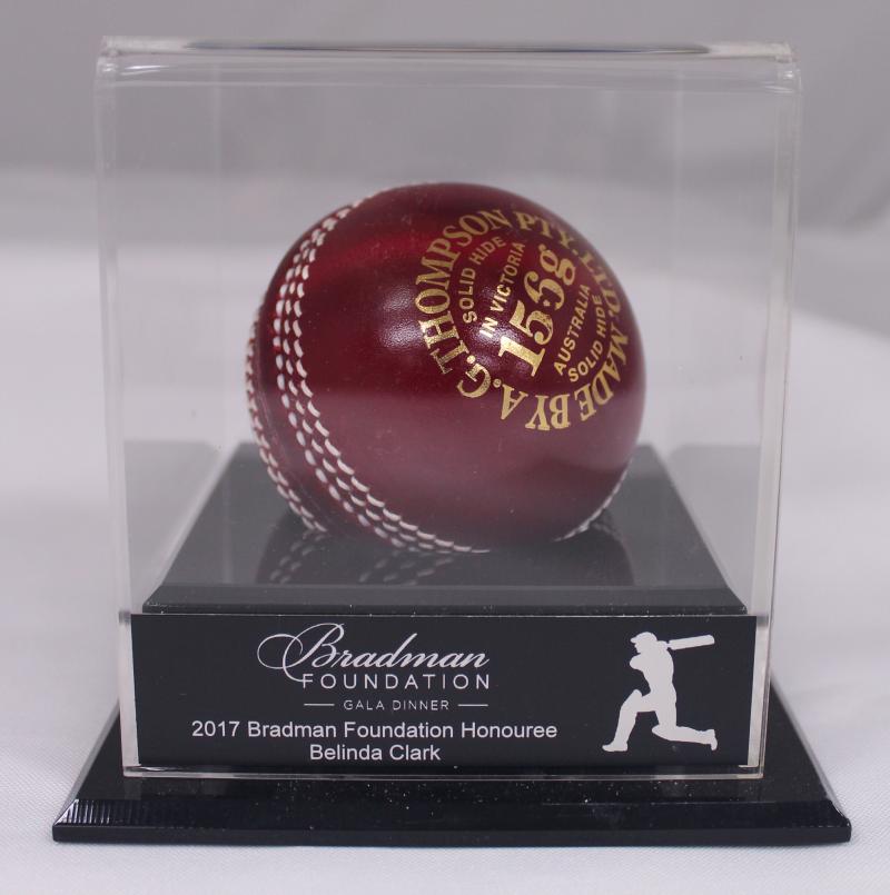 Bradman Foundation Gala Dinner - Belinda Clark signed ball; framed badges (faded) '1930 Australian XI' [15]; Bradman $5 Coin; wall plaque; metal figurine & marker, mainly Fine.