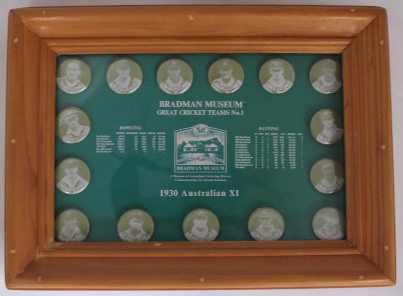 Bill Brown, Bill Ferguson (scorer), Merv Waite, Charlie Walker, Lindsay Hassett, Bill Jeanes, Stan McCabe, Bill O'Reilly, Ben Barnett, Ernie McCormick, Frank Ward, Chuck Fleetwood-Smith & Ted White, window mounted with 16 cigarette cards (with the