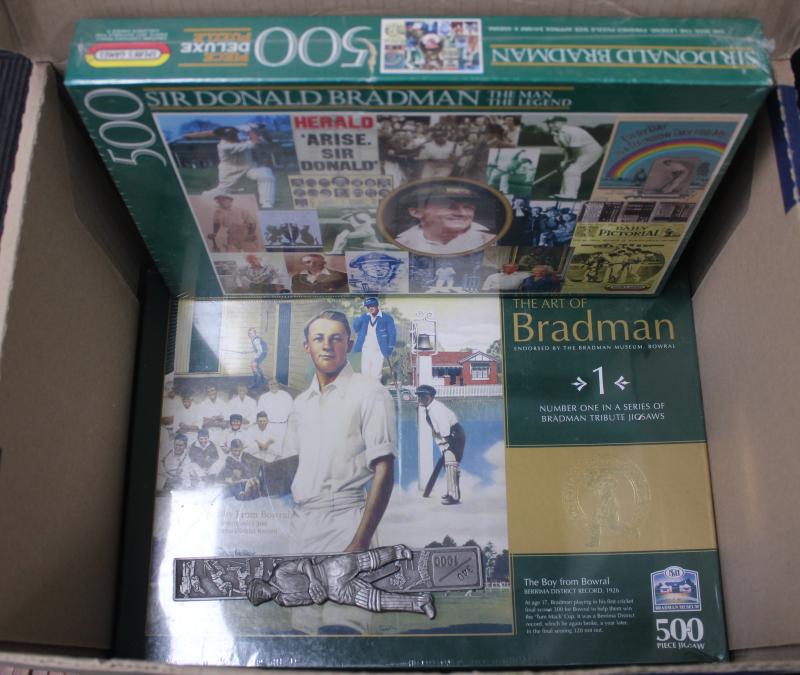DON BRADMAN: Collection with small pill boxes (2) Bradman stance & Bradman pull shot; Bradman 500 piece jigsaw puzzles (2); 2017