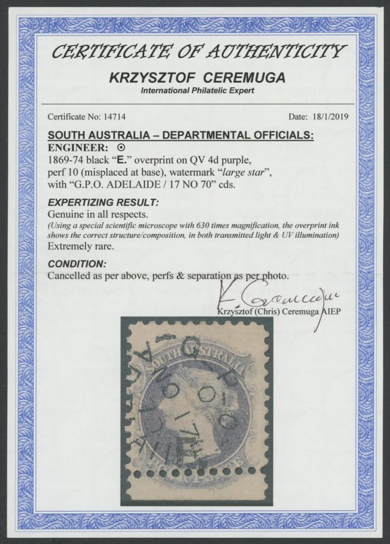 BLACK OVERPRINT: 'E.' on QV Perkins Bacon Large Star Wmk Perf 11½-12½ 4d slate-violet SG DO201, a little aged, indistinct GPO cds,