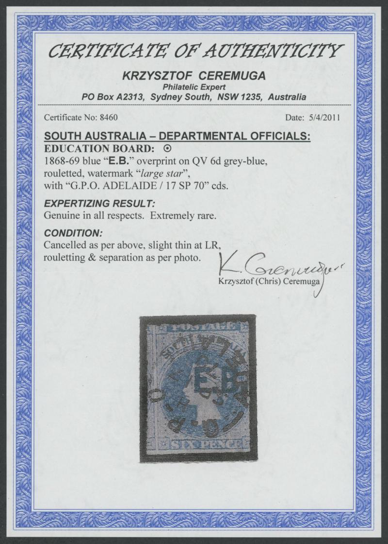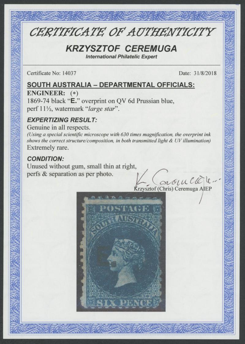 BLACK OVERPRINT: 'E.' on QV Perkins Bacon Large Star Wmk Perf 11½-12½ 6d Prussian blue SG DO202a, a few short/pulled perfs & a