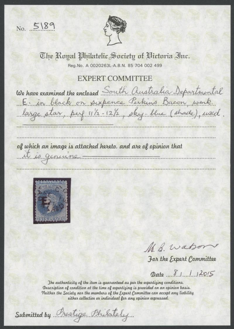 BLACK OVERPRINT: 'E.' on QV Perkins Bacon Large Star Wmk Perf 11½-12½ 6d pale blue (Ron Butler's 'sky blue') SG DO202, 'AWCO'