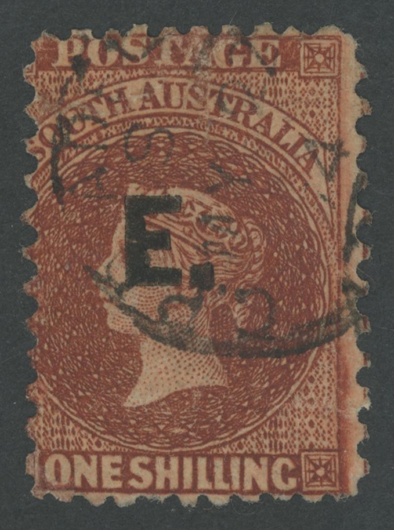 BLACK OVERPRINT: 'E.' on QV Perkins Bacon Large Star Wmk Regular Compound Perf 11½-12½x10 1/- red-brown on brownish tinted paper SG