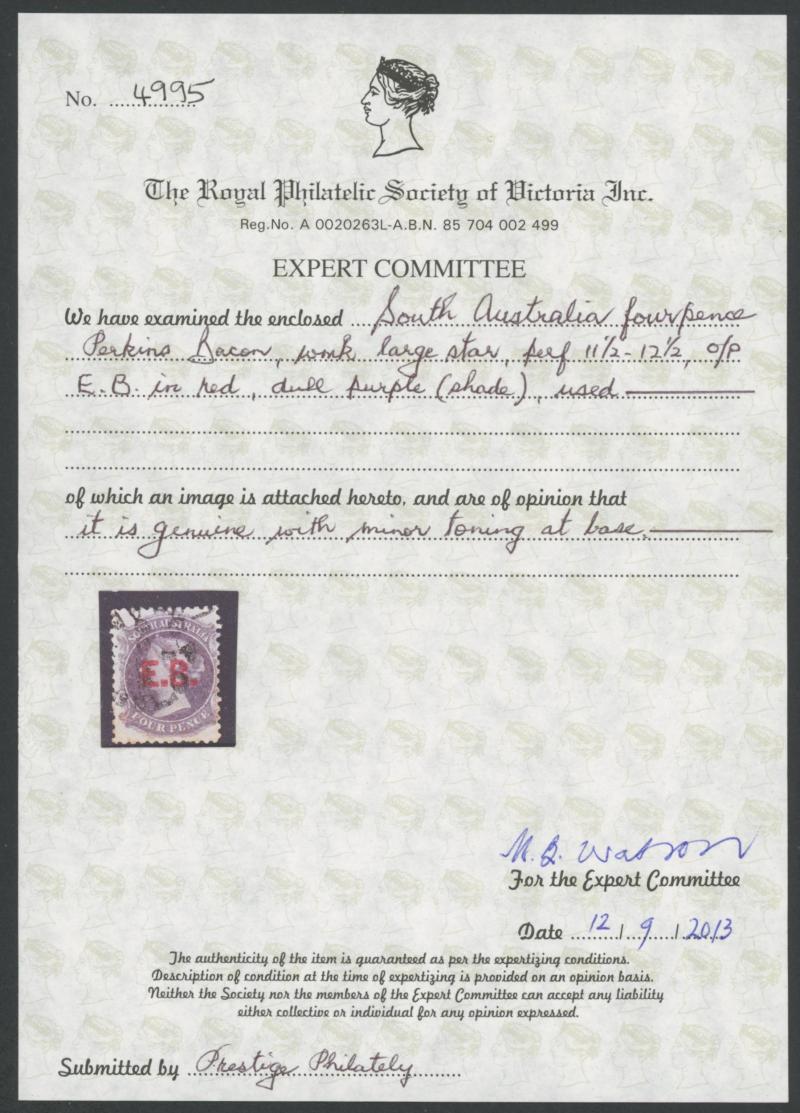 RED OVERPRINT: 'E.B.' on QV Perkins Bacon Large Star Wmk Perf 11½-12½ 4d deep violet SG DO212, well-centred, light toning, untidy