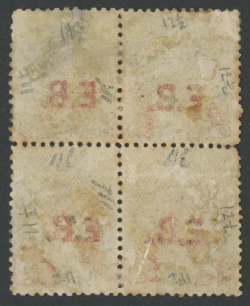 RED OVERPRINT: 'E.B.' on QV Perkins Bacon Large Star Wmk Perf 11½-12½ 4d deep violet SG DO212 block of 4, minor blemishes, GPO cds