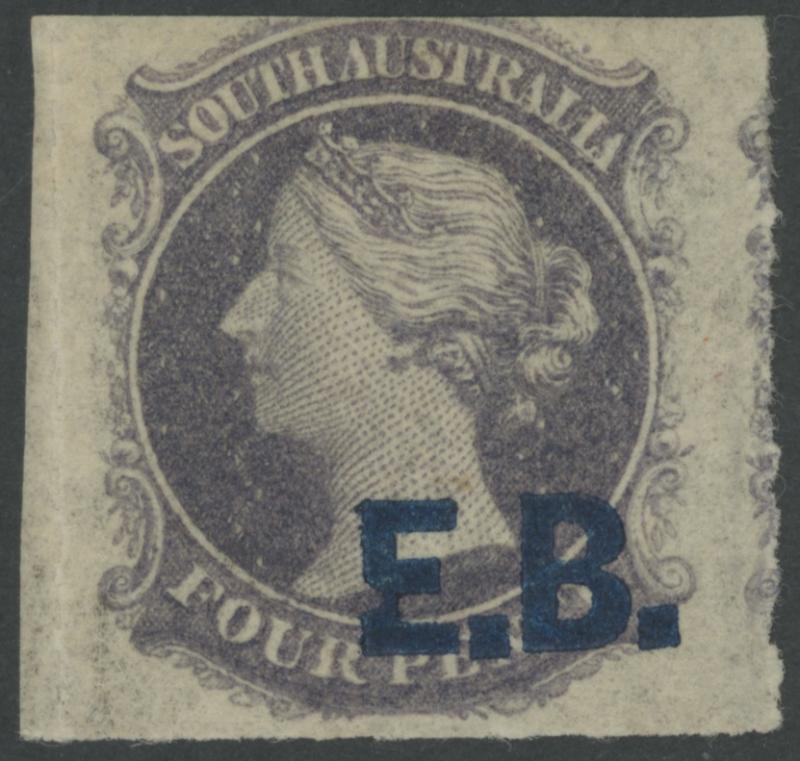 BLUE OVERPRINT: 'E.B.' on QV Perkins Bacon Large Star Wmk Rouletted 4d dull purple SG DO214, rouletting on all sides, separation
