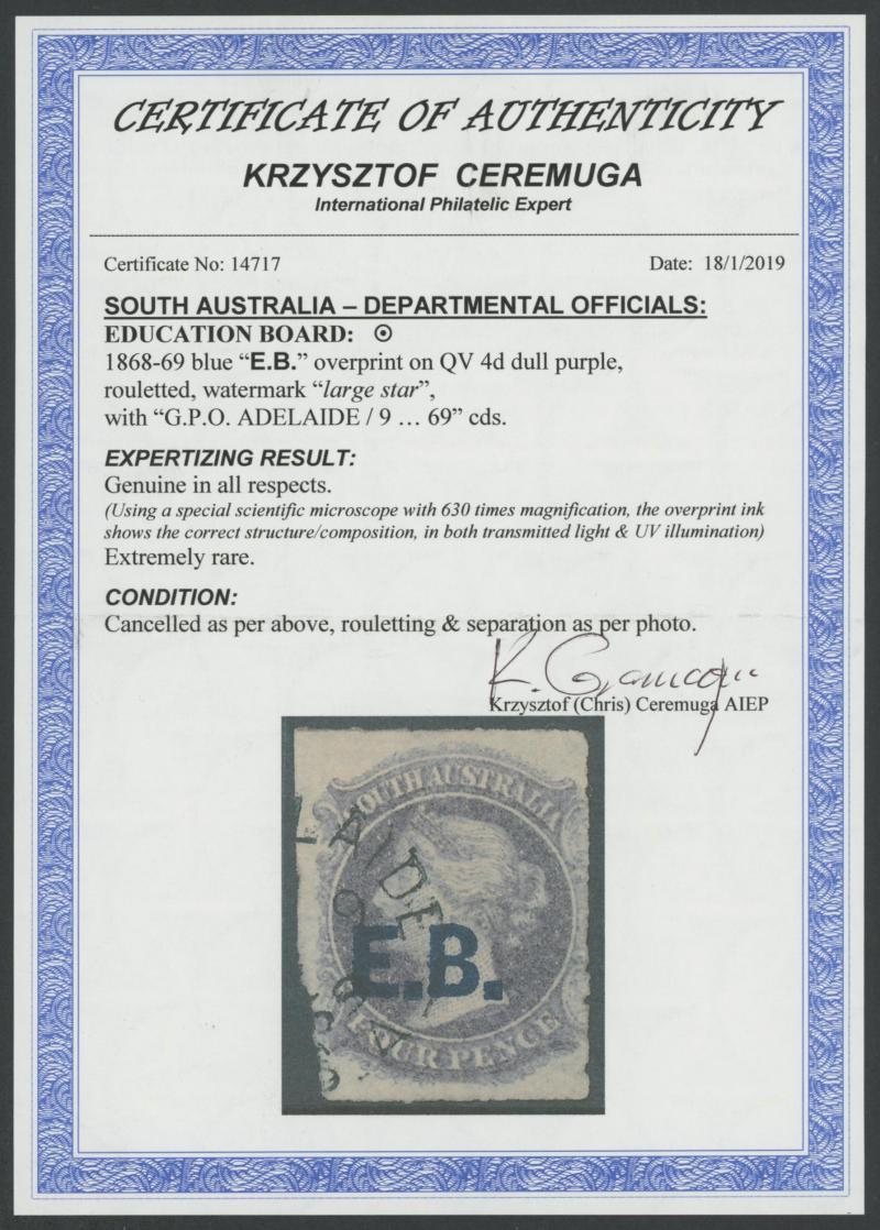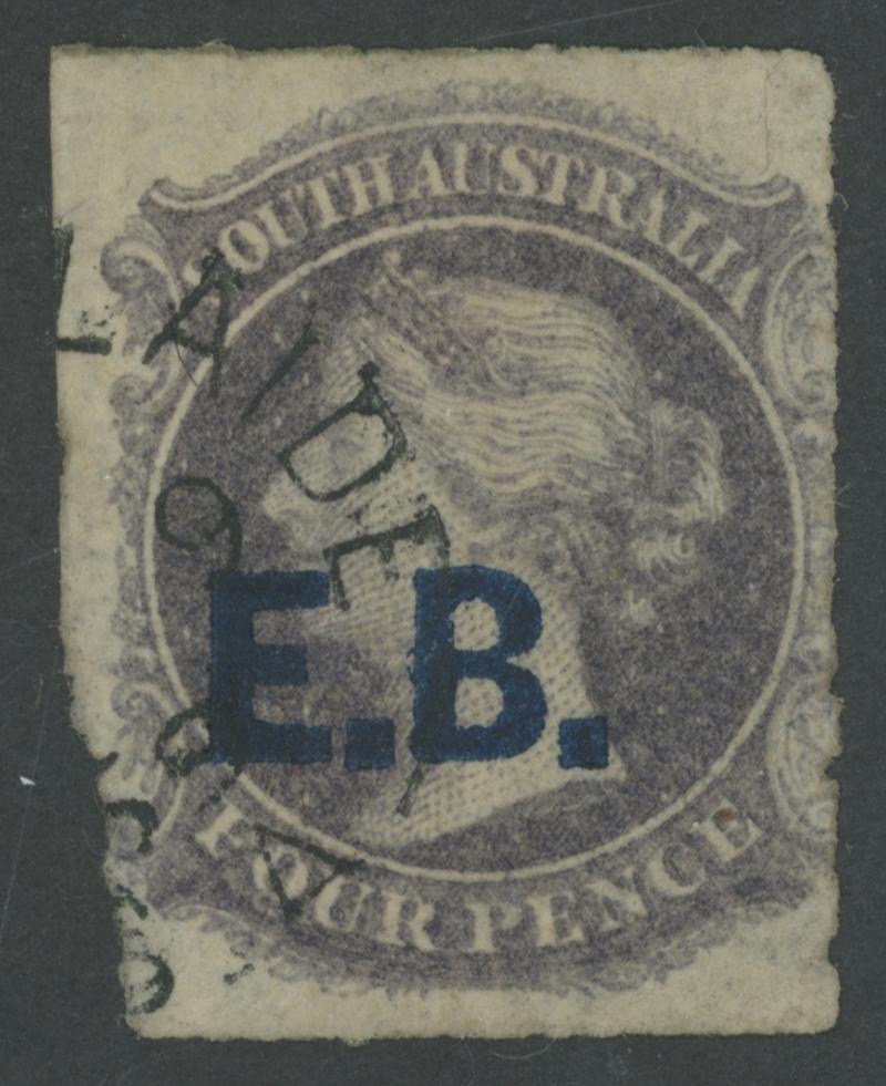 BLUE OVERPRINT: 'E.B.' on QV Perkins Bacon Large Star Wmk Rouletted 4d dull purple SG DO214 with Nick in the Upright of 'E', from