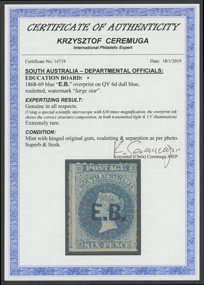 BLUE OVERPRINT: 'E.B.' on QV Perkins Bacon Large Star Wmk Rouletted 6d dull blue SG DO215 from the right of the sheet with vertical