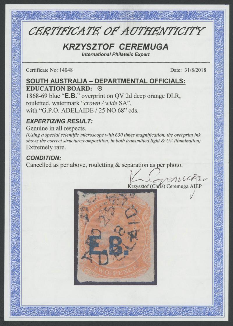 BLUE OVERPRINT: 'E.B.' on QV De La Rue Crown/SA Wmk Rouletted 2d red-orange SG DO213 from the base of the sheet with horizontal
