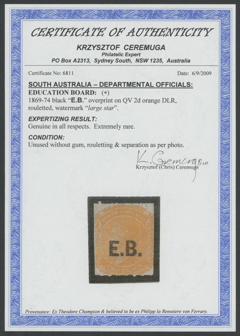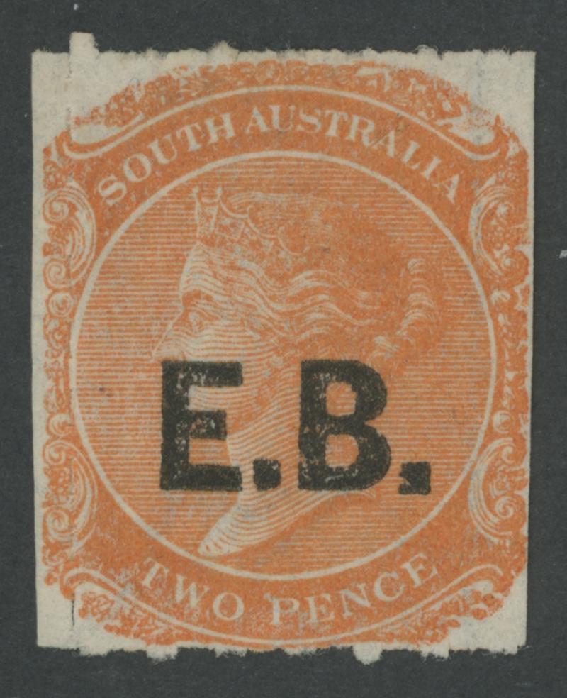 BLACK OVERPRINT: 'E.B.' on QV De La Rue Large Star Wmk Rouletted 2d orange SG DO216a marginal example from the right of the sheet