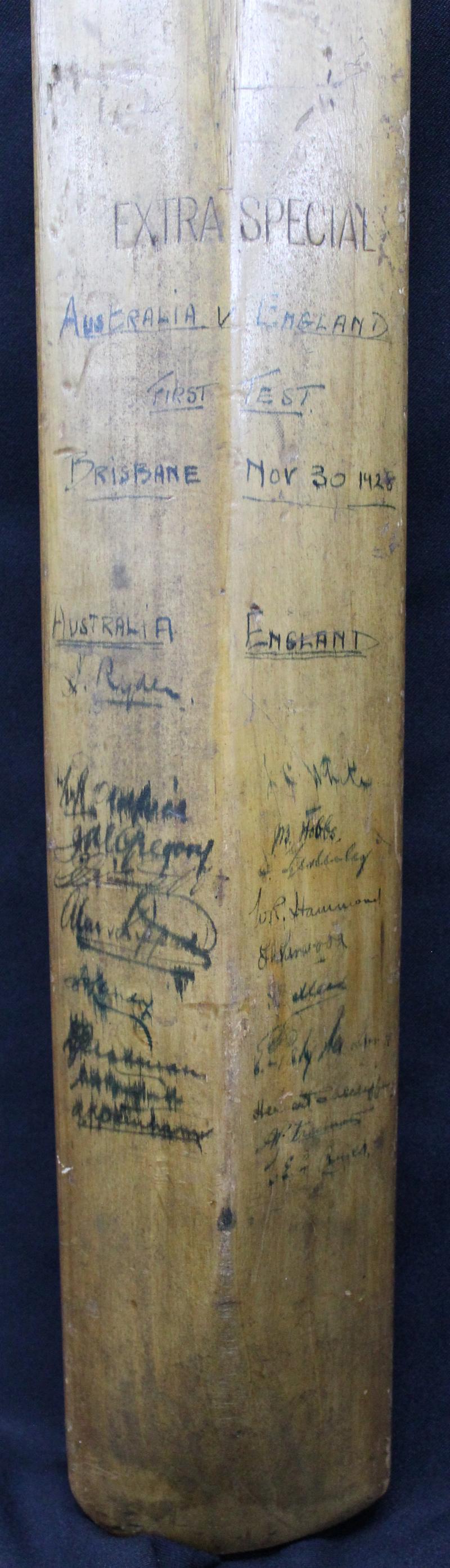 30th 1928' signed by 9 Australians - Jack Ryder, Bert Oldfield, Jack Gregory, Clarrie Grimmett, Alan Kippax, 'Stork' Hendry, Don Bradman, Bill Ponsford & Ron Oxenham; plus 10 Englishmen - Jack White, JB Hobbs, Ernest Tyldesley, Walter Hammond, Harold