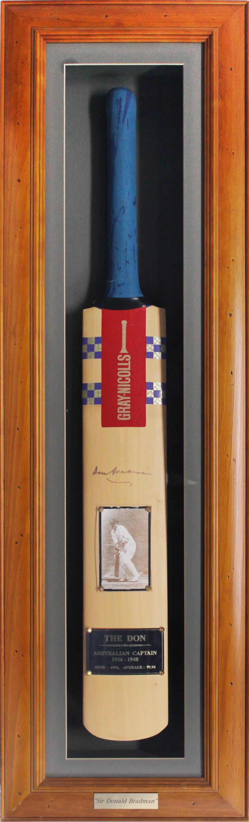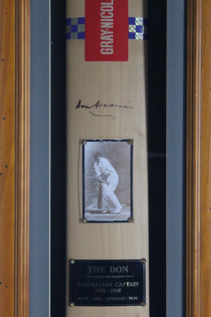 DON BRADMAN: 'Sir Donald Bradman' display comprising 'Gray-Nicolls' cricket bat signed on front by Don Bradman (some fading), in