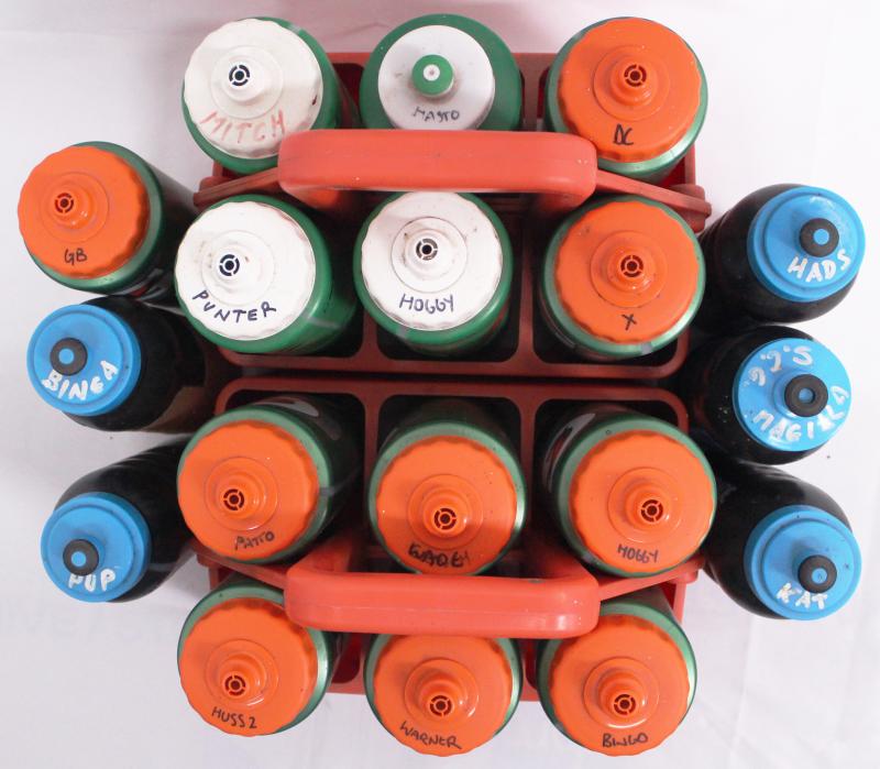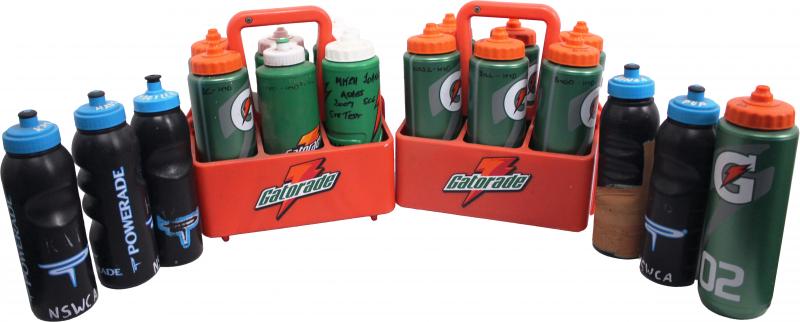 Drink Bottles two Gatorade crates containing 13 player's game day/match drink bottles with nicknames on top - Punter - Ricky