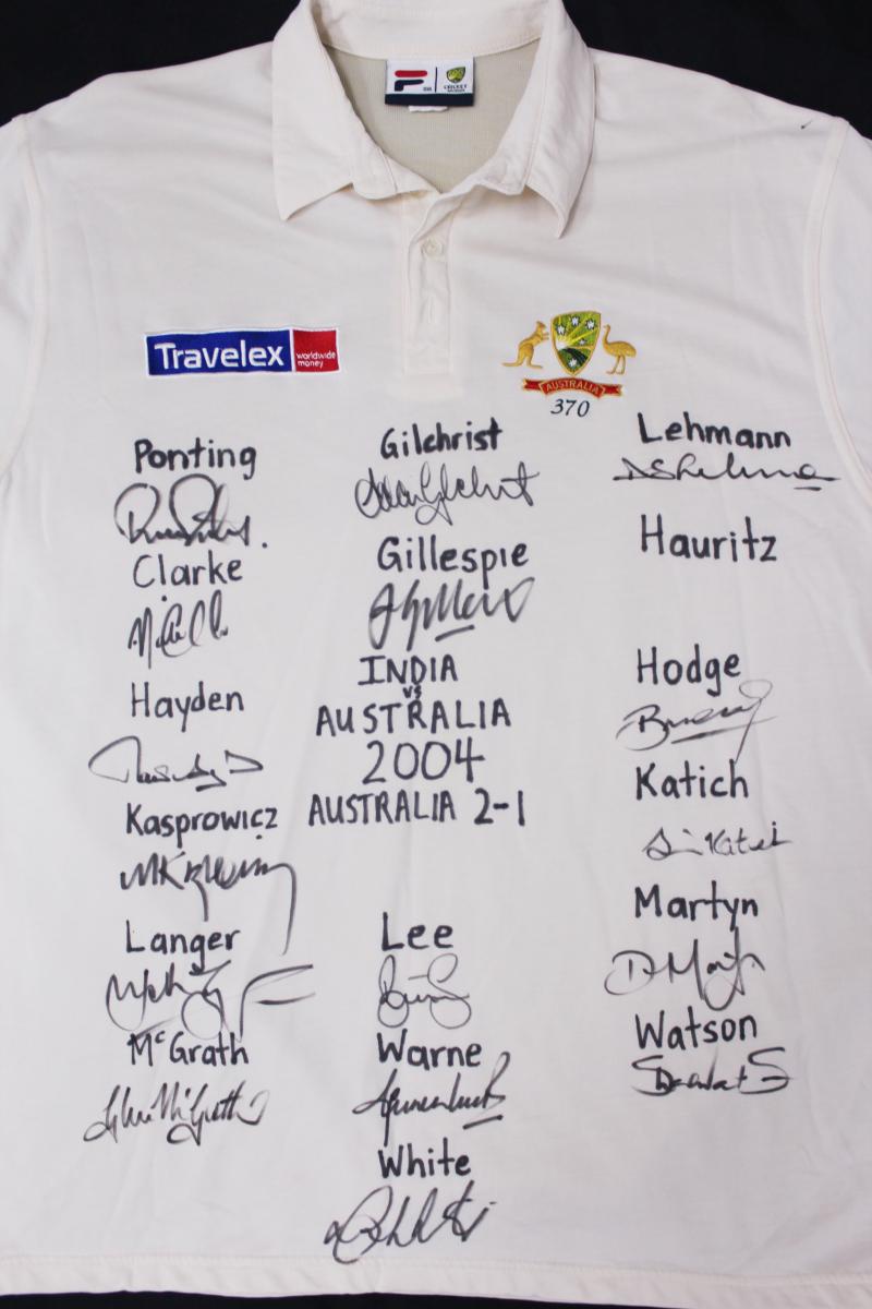 worn, endorsed on front 'INDIA vs AUSTRALIA 2004. AUSTRALIA 2-1' with 16 signatures including Ricky Ponting, Adam Gilchrist, Michael Clarke & Simon Katich. Ex Jason Gillespie collection. (Image1) (Image2)