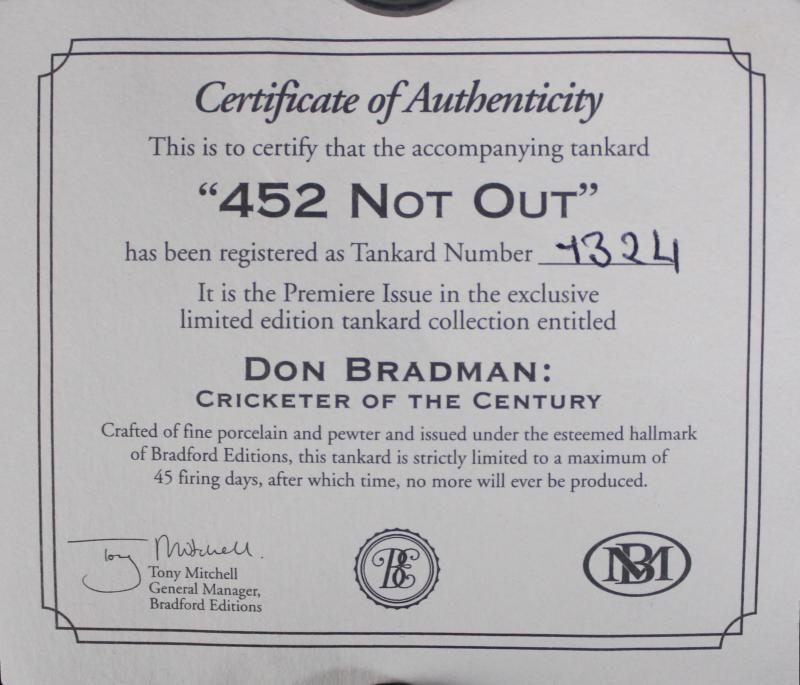 DON BRADMAN: Beer Tankard '452 Not Out' from the Don Bradman Cricketer of the Century Tankard Collection, 19cm high, Fine