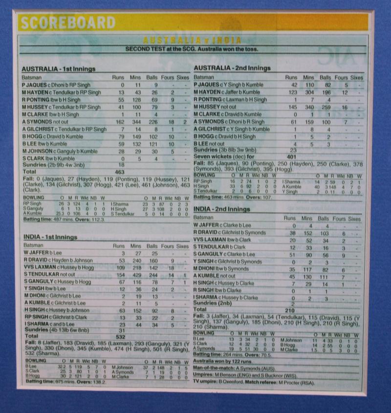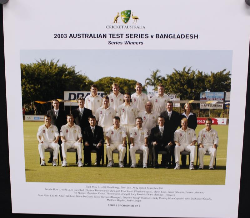 with individual photographs, framed & glazed, overall 110x82cm. [Australia won the Test to complete a 5-0 "whitewash". This Test was notable for the retirements of Shane Warne, Glenn McGrath & Justin Langer]. Ex SCG 'Roomy' Bobby Barter. (Image1) (Image2)