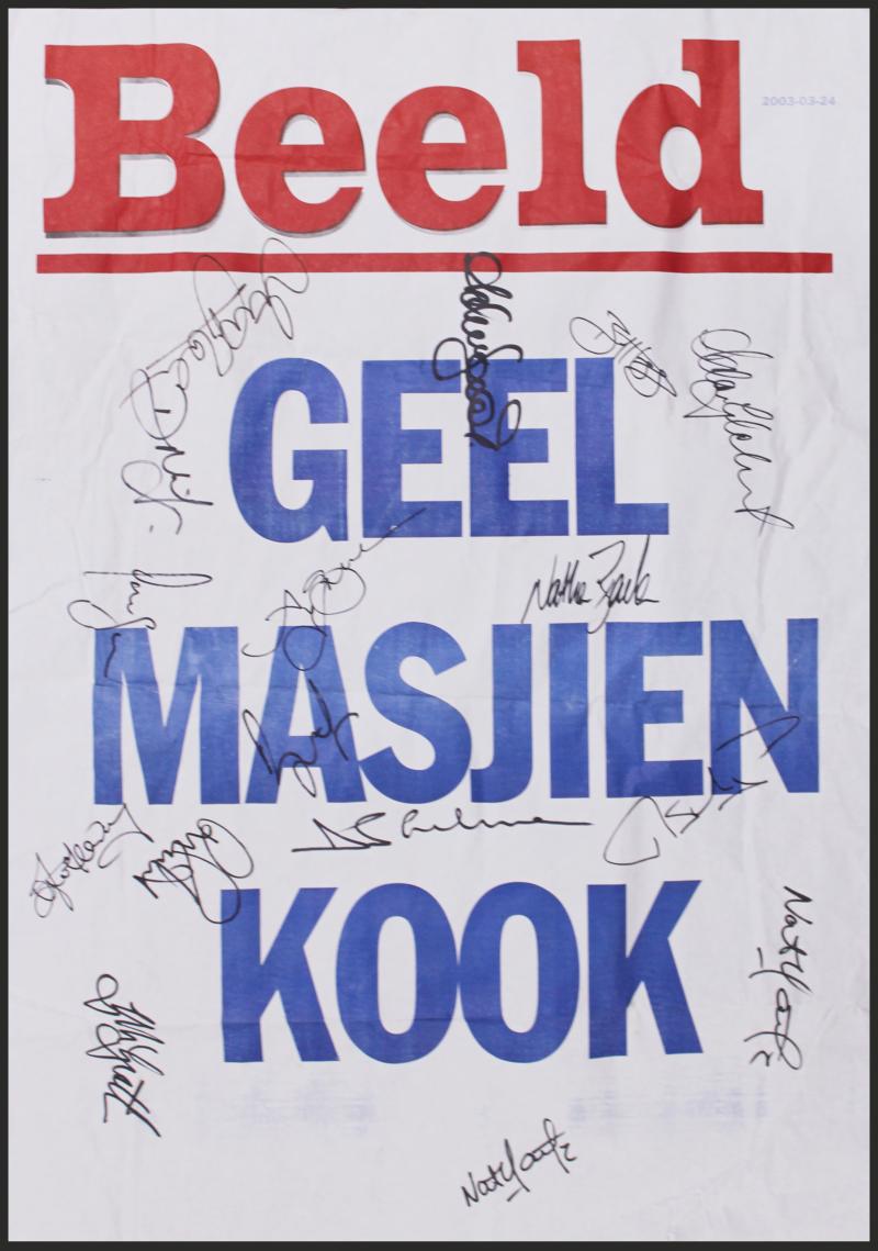 2003 World Cup Newspaper banner 'Beeld 2003-03-24. GEEL MASJIEN KOOK' (Yellow Machine Cooking) dated the day after Australia's