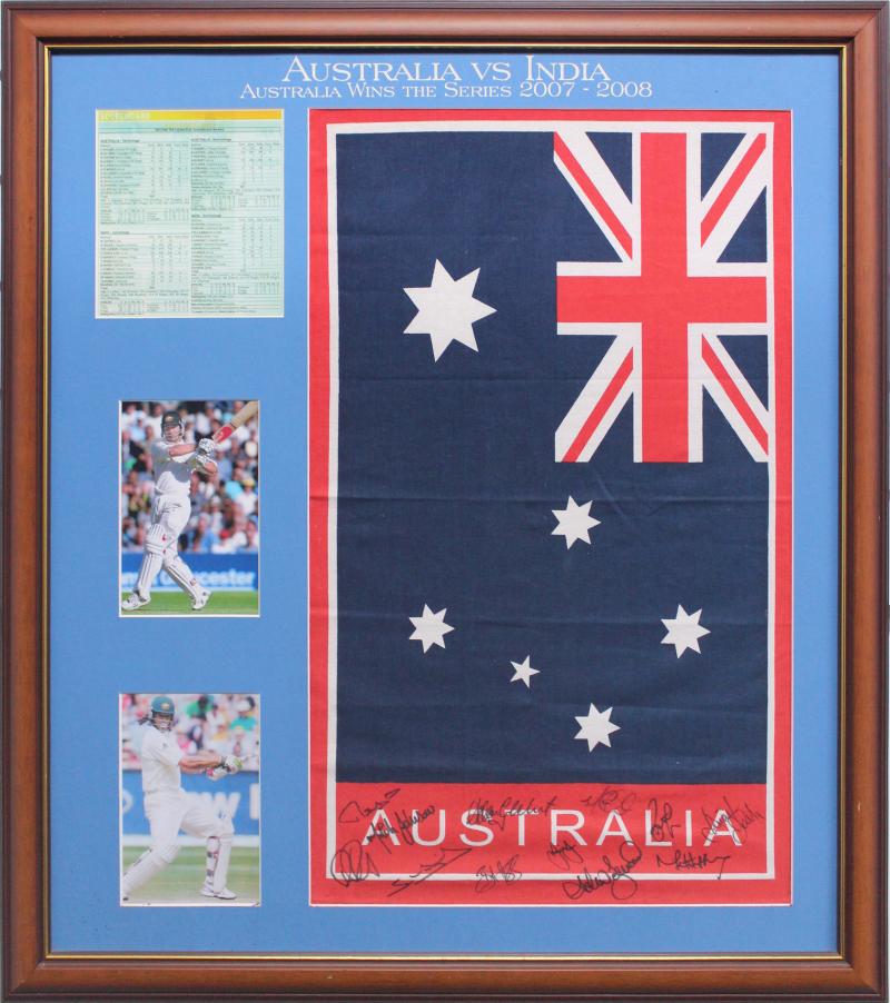 2007-08 Australia v India display comprising linen Australia Flag tea-towel, with 12 signatures - Matthew Hayden, Mitchell Johnson,