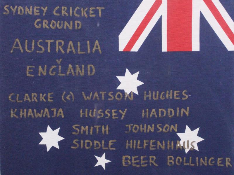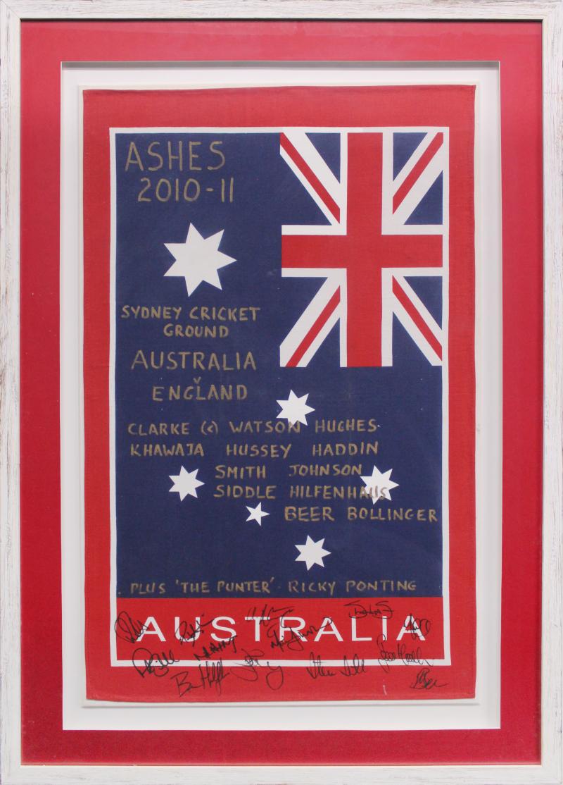 2010-11 Australia v England display comprising linen Australia Flag tea-towel, endorsed 'ASHES 2010-11, SYDNEY CRICKET GROUND,