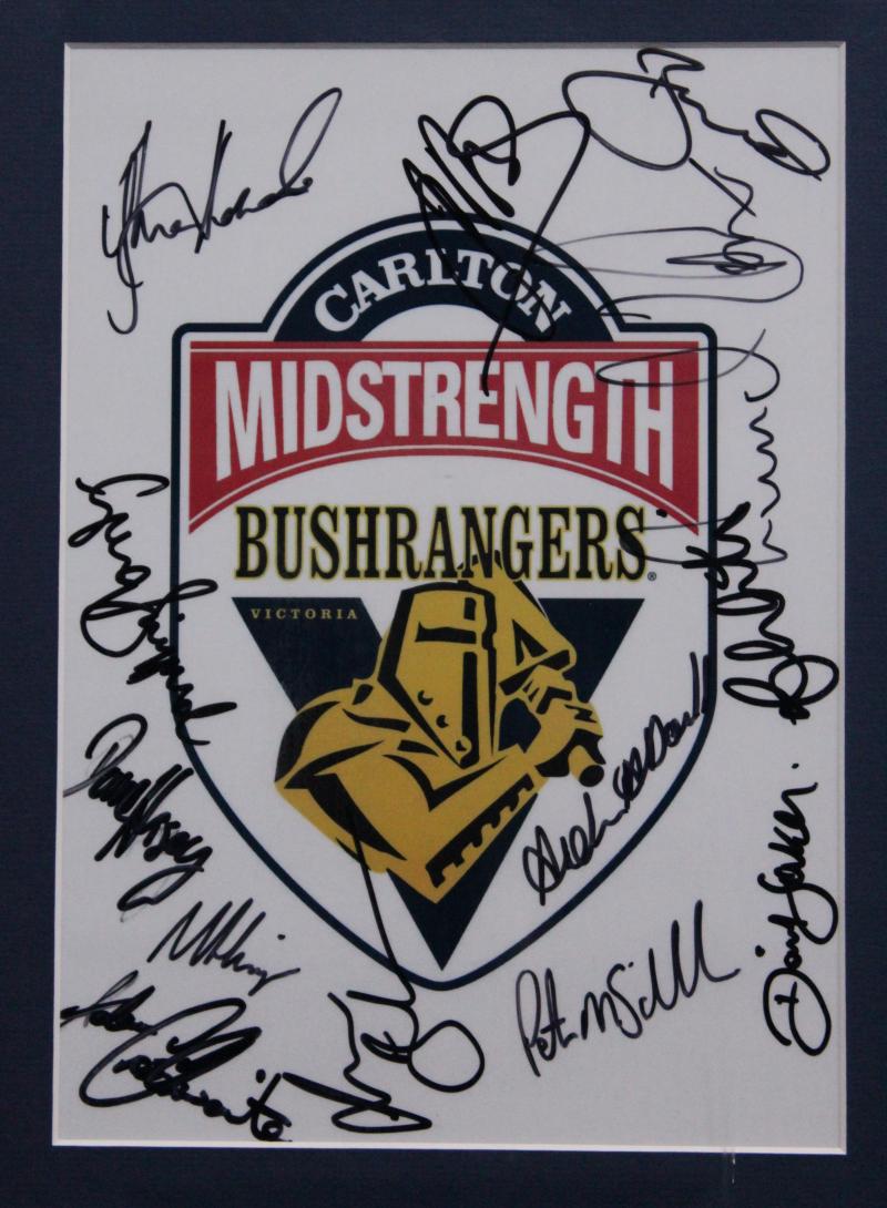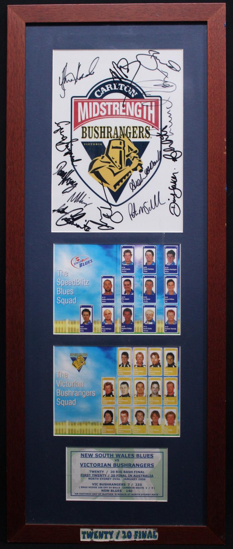2005-06 First Twenty20 Final Victoria v NSW, display with Bushrangers logo with 13 signatures including Brad Hodge & Cameron White,