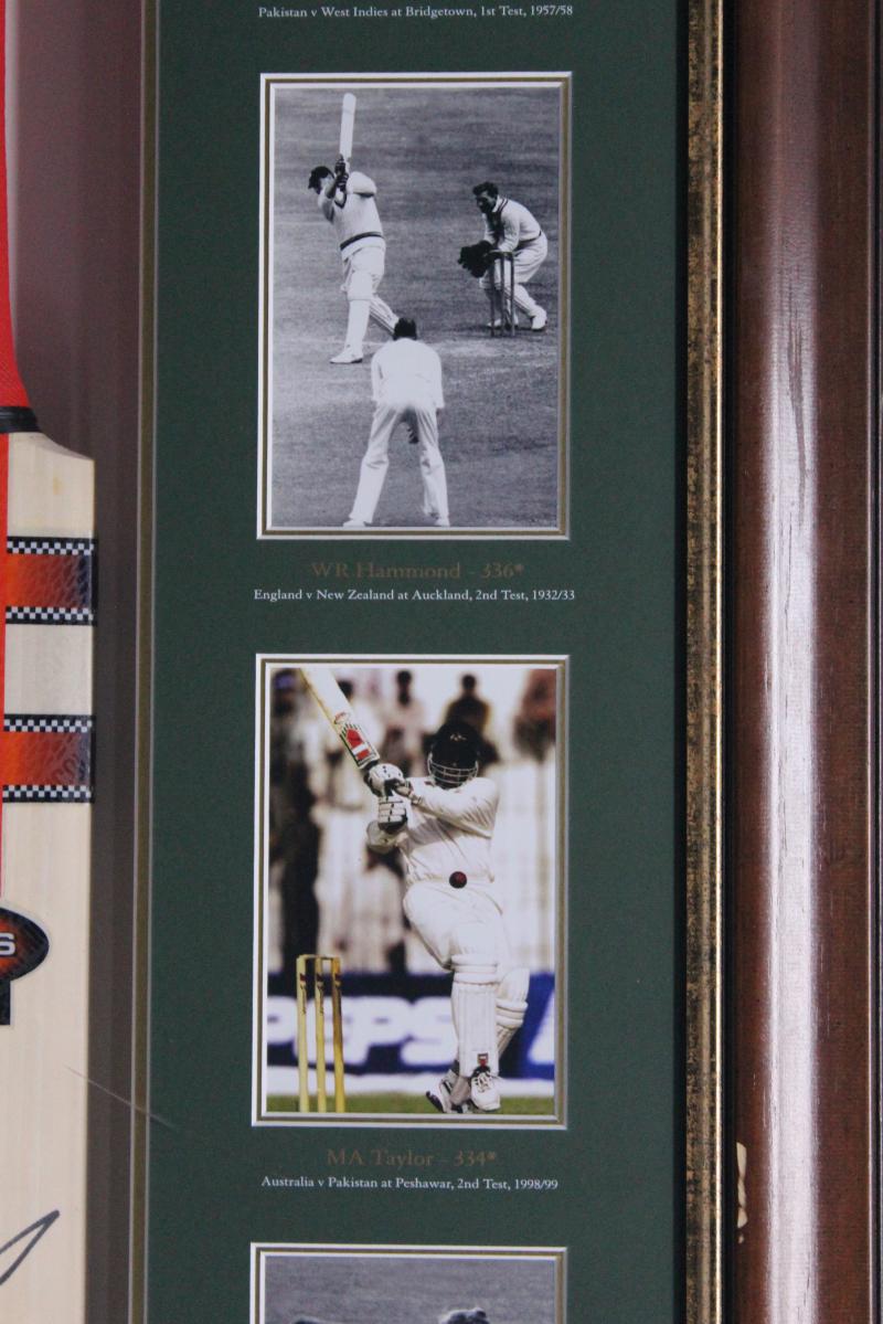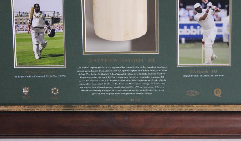 MATTHEW HAYDEN: 'Matthew Hayden - On Top of the World' display commemorating Hayden's 380, with signed cricket bat, mounted in