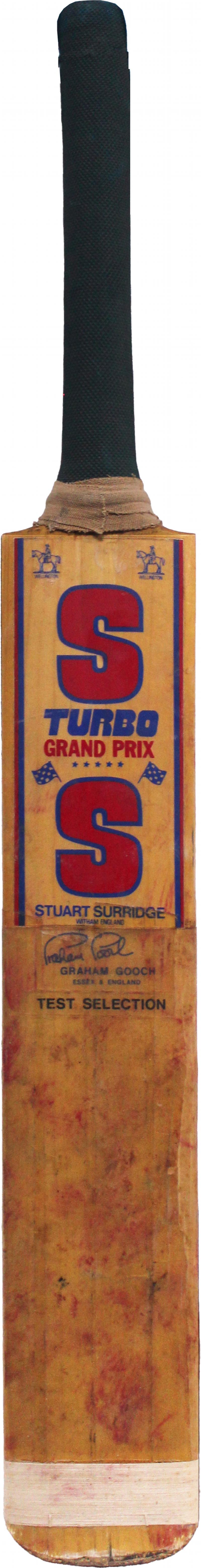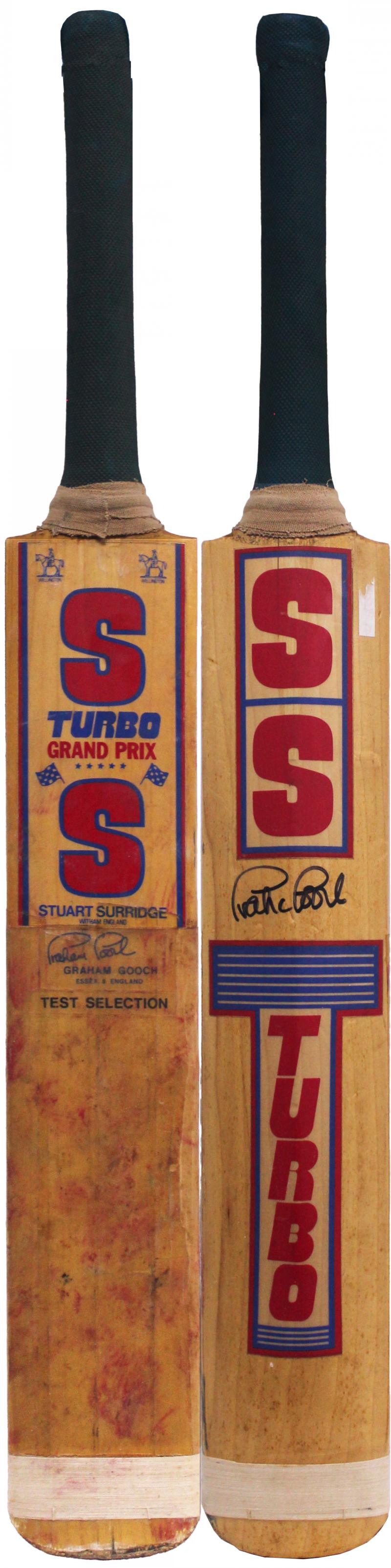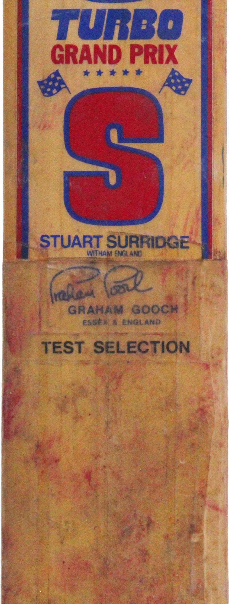 GRAHAM GOOCH: 'Stuart Surridge - Turbo Grand Prix' match-used cricket bat signed on reverse by Graham Gooch, Fair/Fine condition.