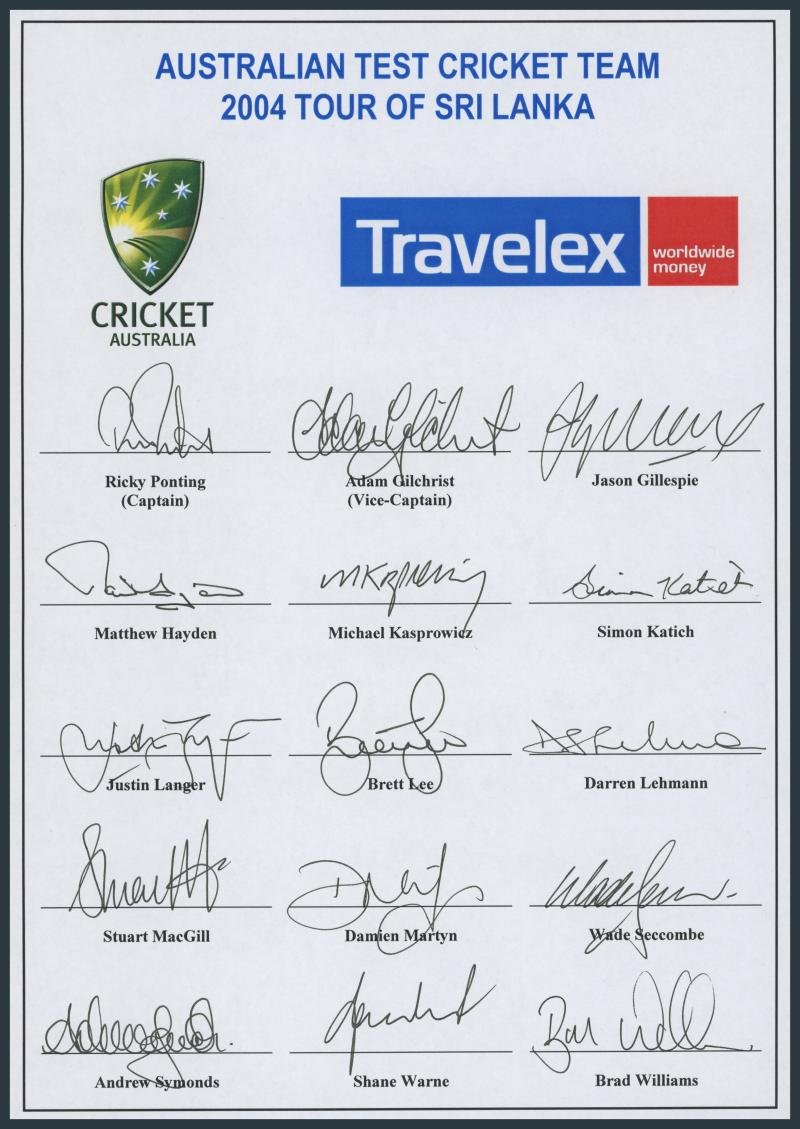 Team Sheet 2004 Australian Test Team for Tour of Sri Lanka, official team sheet with 15 signatures including Ricky Ponting