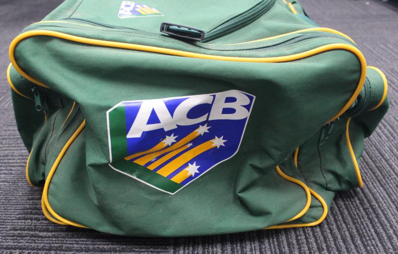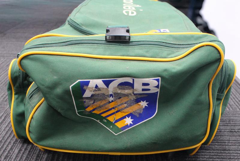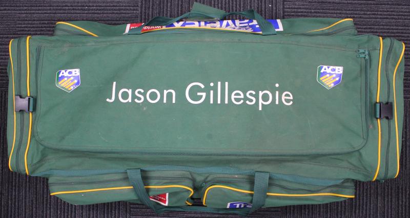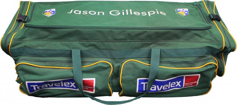 JASON GILLESPIE: Australian Cricket Bag with ACB & Travelex logos, named 'Jason Gillespie' on top, circa 109x50x30cm, Fair/Fine