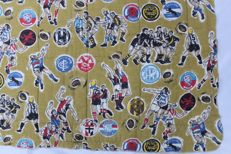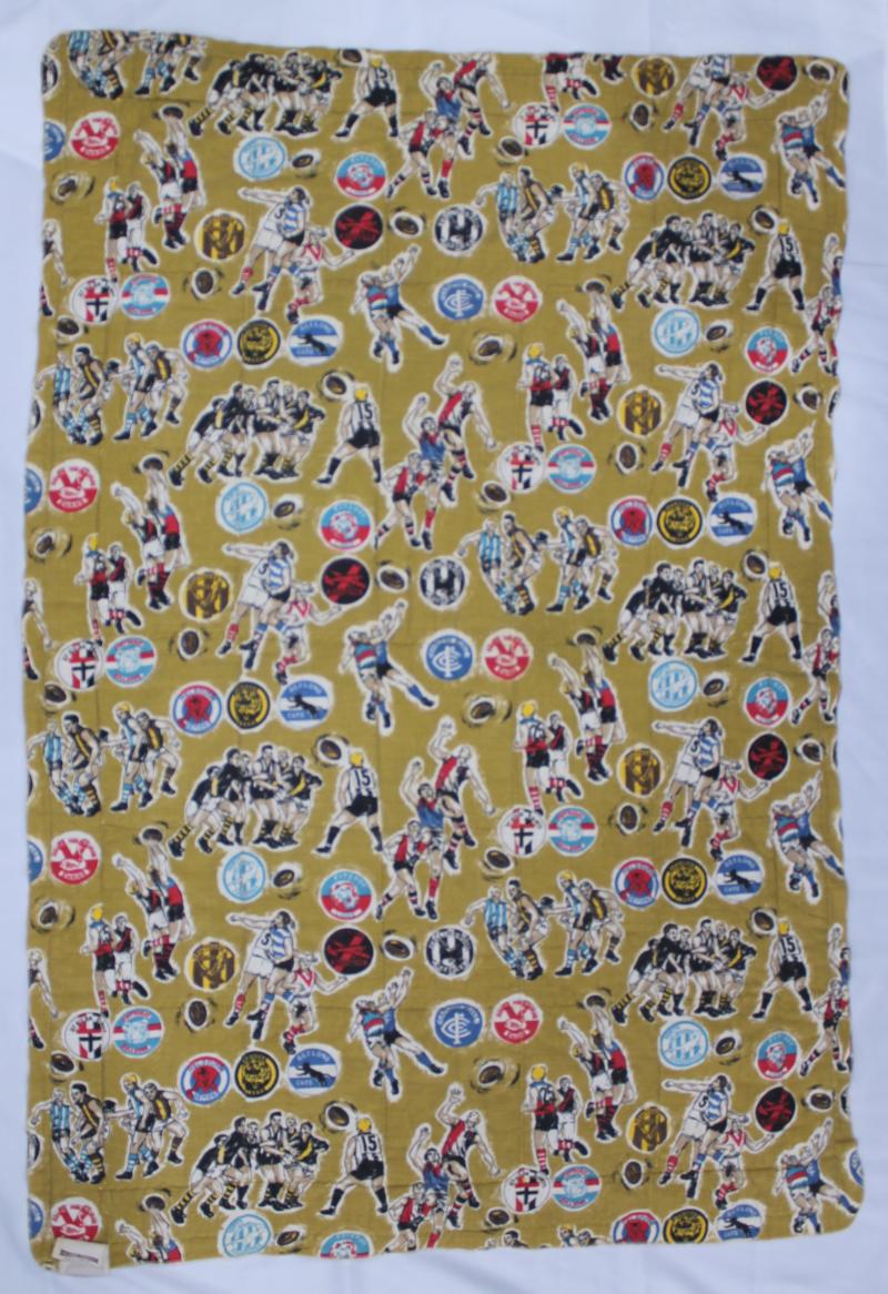 Quilt attractive material with action football scenes and mascots of the 12 VFL clubs, made by Sleepmaster, size 106x156cm, mainly