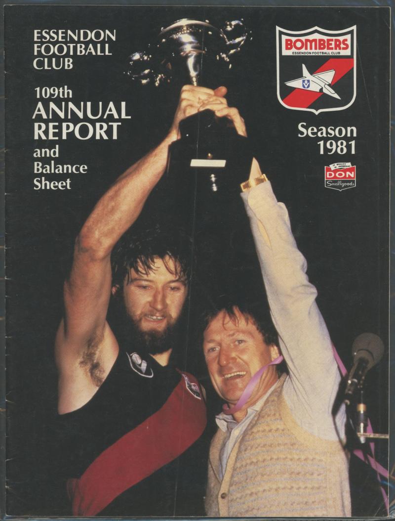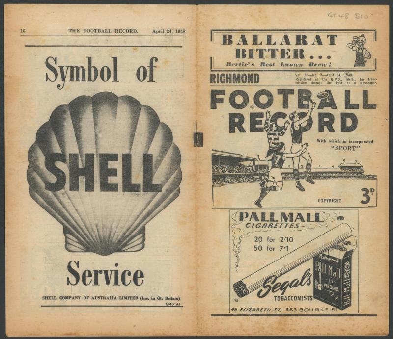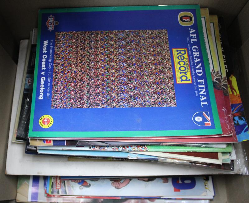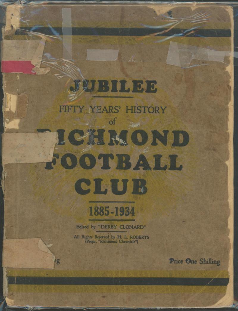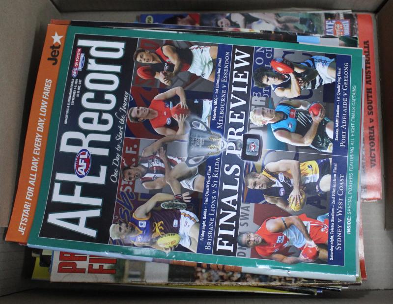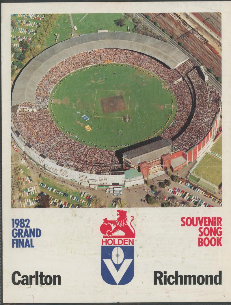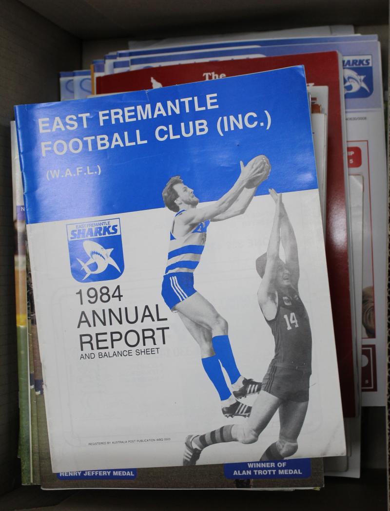to VFL; 'Jubilee - Fifty Years of Richmond Football Club 1885-1934'; '1982 Grand Final Souvenir Song Book'; Fold-Out Poster Magazines (14); Practice match programmes (8); various club annual reports (38) & magazines (57); 1987 Scanlens box; place