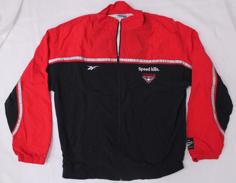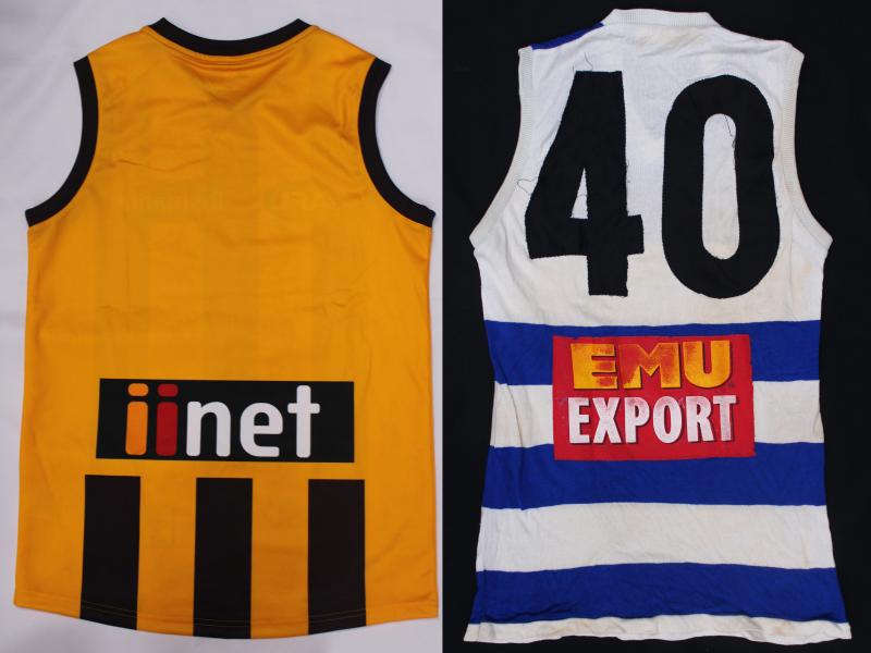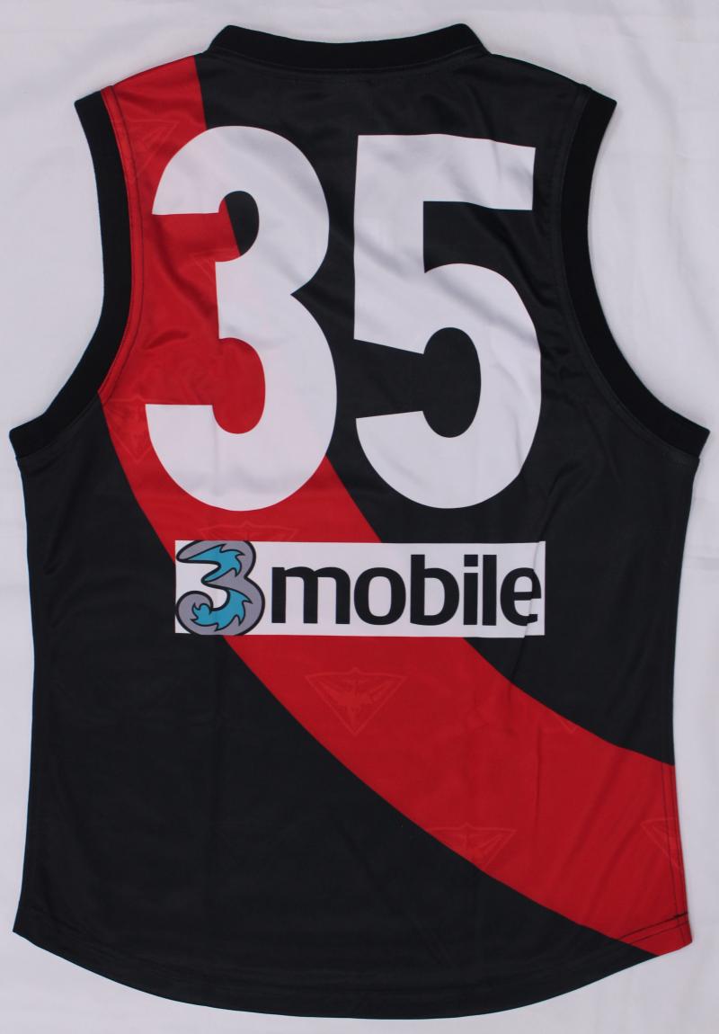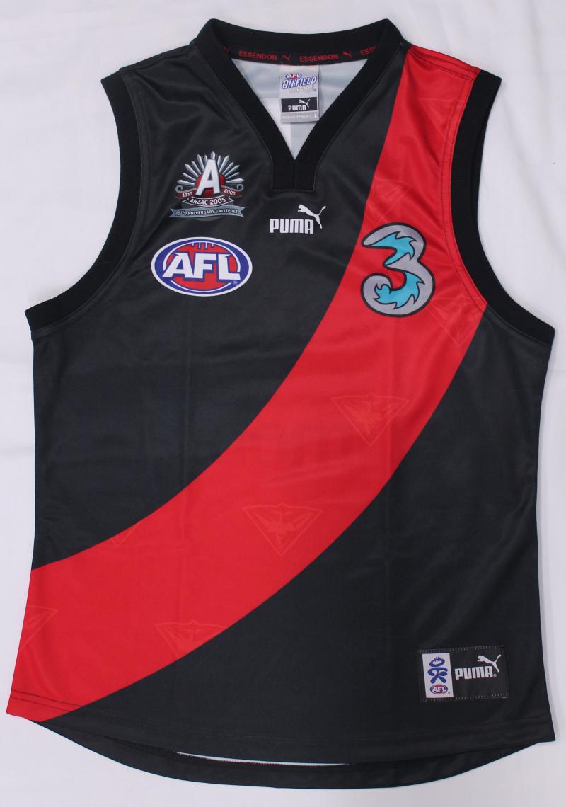Football jumpers Hawthorn jumper with 40 signatures; Essendon 2005 Anzac Day jumper with number '35'; East Fremantle jumper with