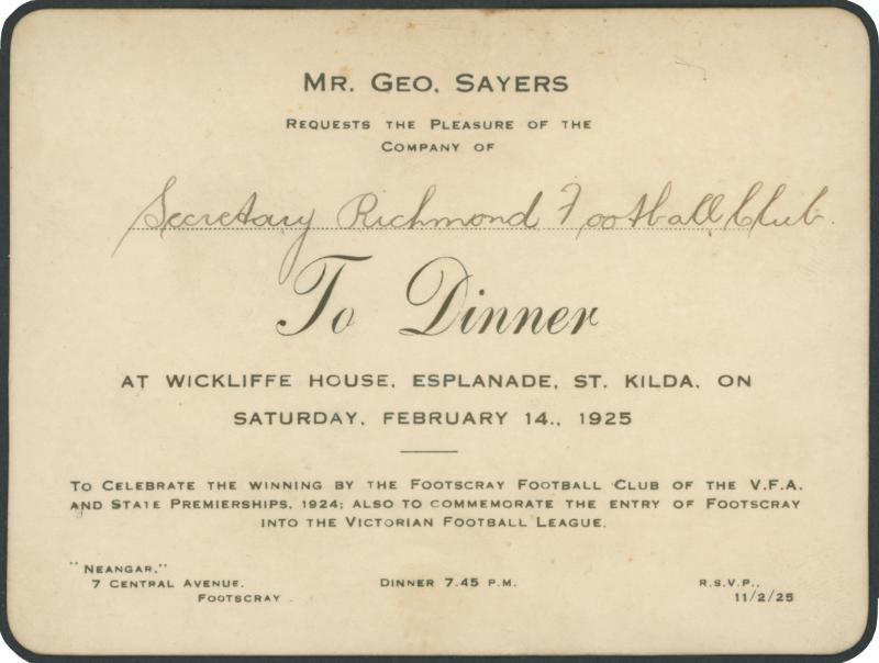 Balance of collection including ephemera with 1925 invitation to Secretary of Richmond FC to dinner celebrating entry of Footscray
