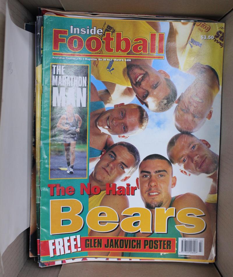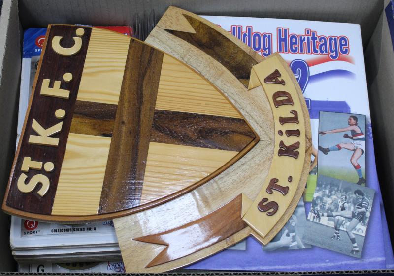 mats (9); books 'The Bulldog Heritage 2' (x3); Footscray badges (330+); Lions clock; St Kilda wooden logo; videos (9), CDs (17) & DVDs (9), mainly Fair/Fine. Inspection will reward.