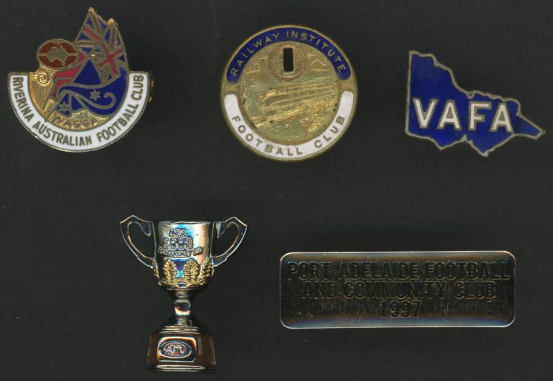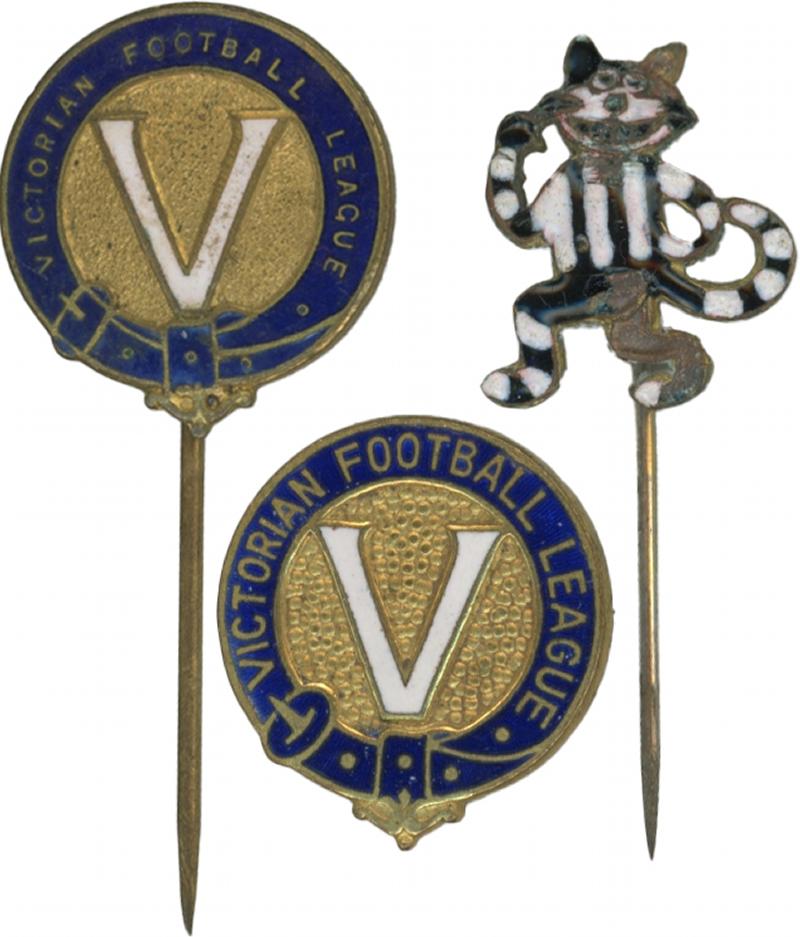 Badges Collection including 'Victorian Football League' badge & pin; 'VAFA'; 'Railway Institute Football Club'; 'Riverina