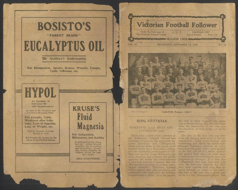 Record 'Victorian Football Follower' Vol.9 No.24 for September 18 1908 Semi-Final Carlton v St Kilda. Some edge and spine faults,