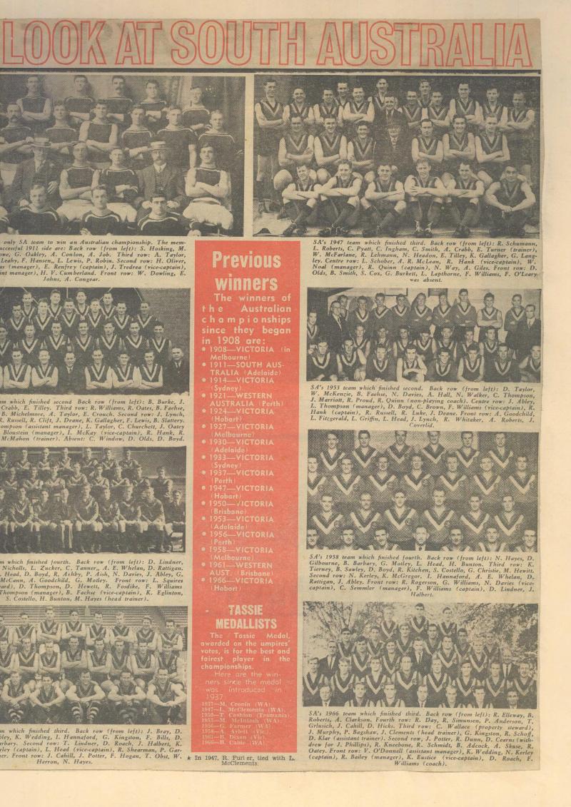 1964, 1967 & 1976; City 1958; Glenorchy (3) - 1969 Vice President, 1980 & 2007; Kilburn Life Member; Konoorong 1967; Maryborough 1956; Paskeville 1952; Port Neill 1967; Salisbury (2) - 1963 & 1984; Scoresby 1976; Semaphore (5) - 1937, 1951, 1961,