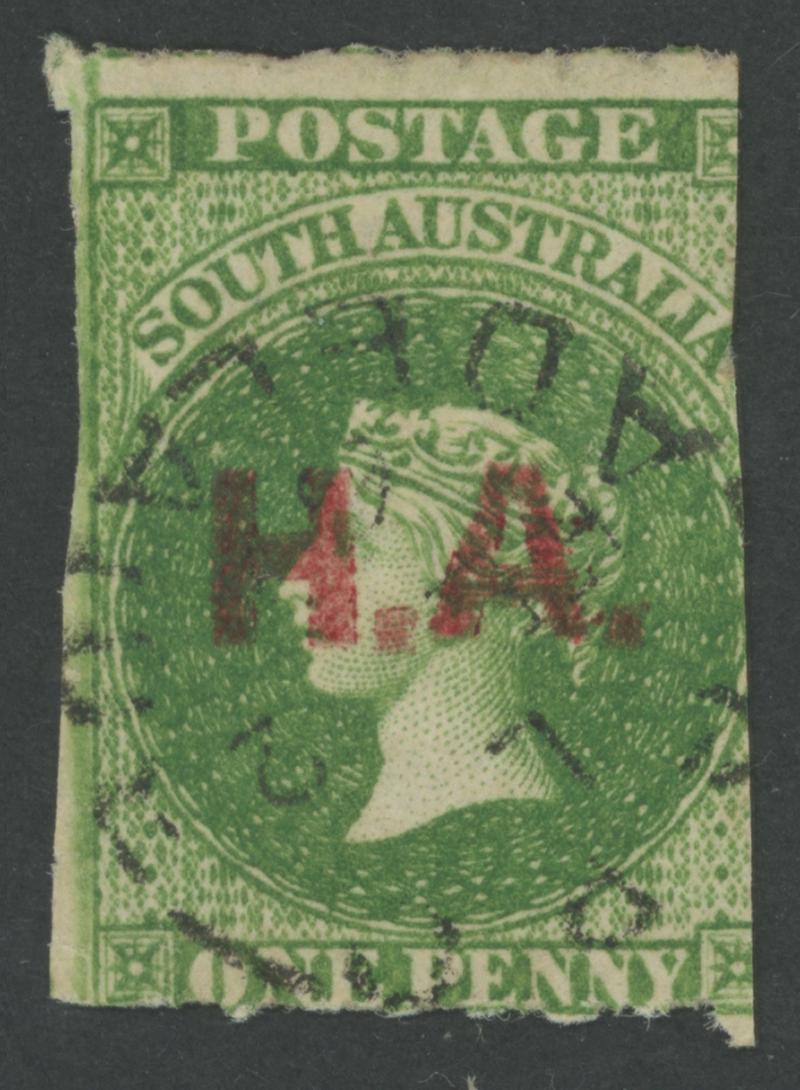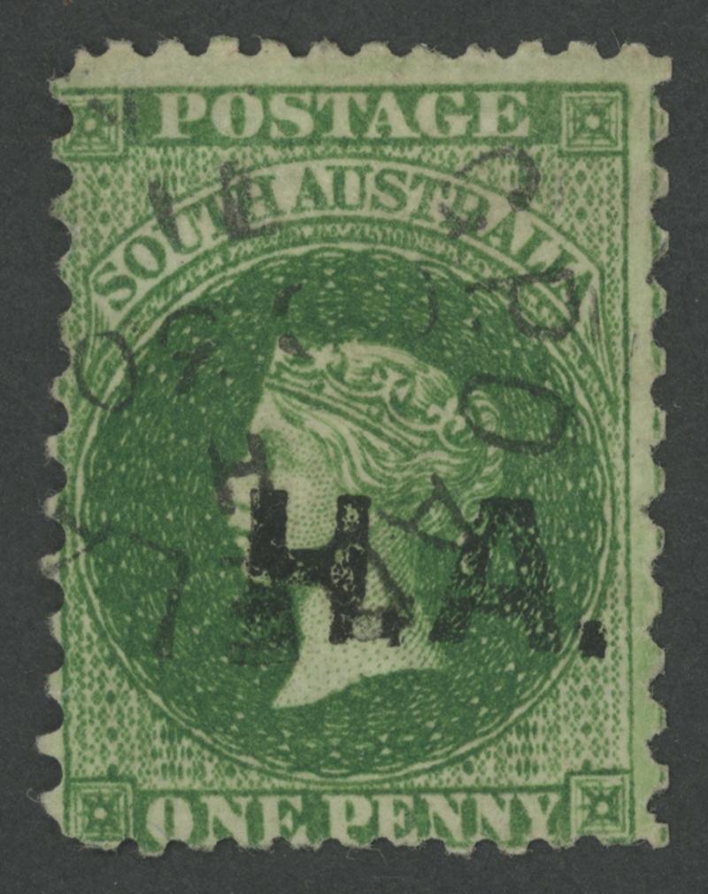 BLACK OVERPRINT: 'H.A.' on QV Perkins Bacon Large Star Wmk Perf 11½-12½ 1d deep yellow-green SG DO267, a large stamp with misplaced
