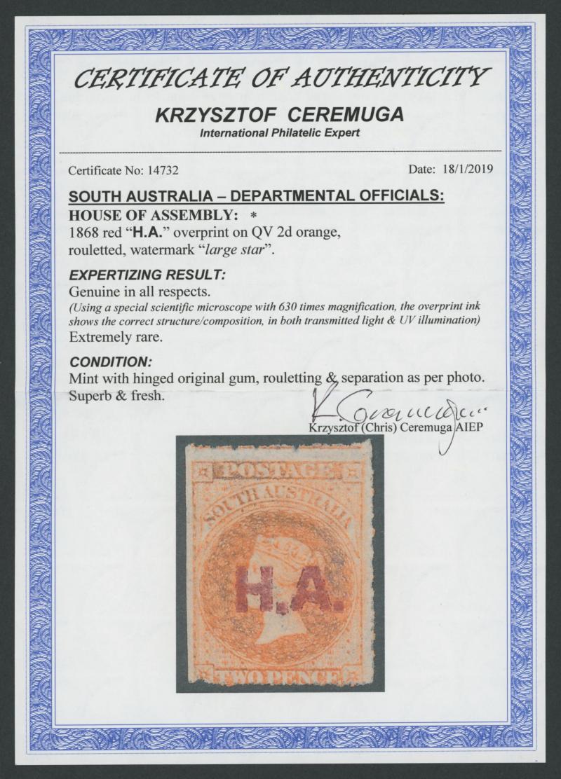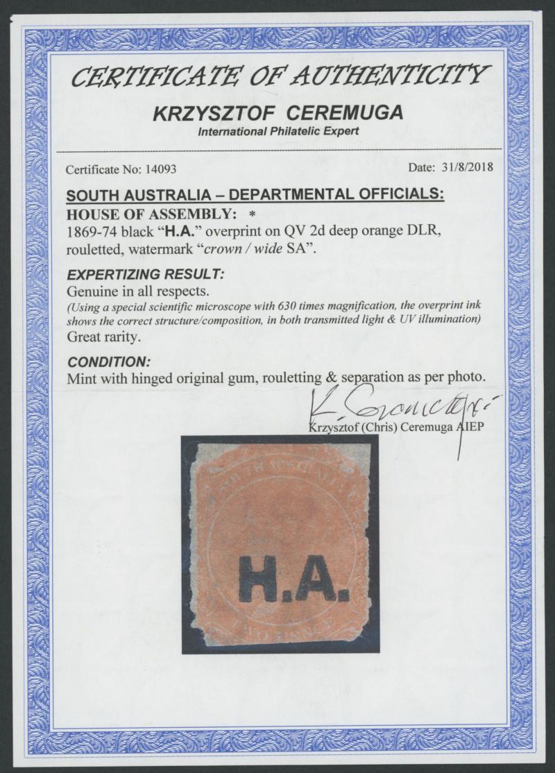 BLACK OVERPRINT: 'H.A.' on QV De La Rue Crown/SA Wmk Rouletted 2d deep brown-orange SG DO264, rouletting on all sides but with some