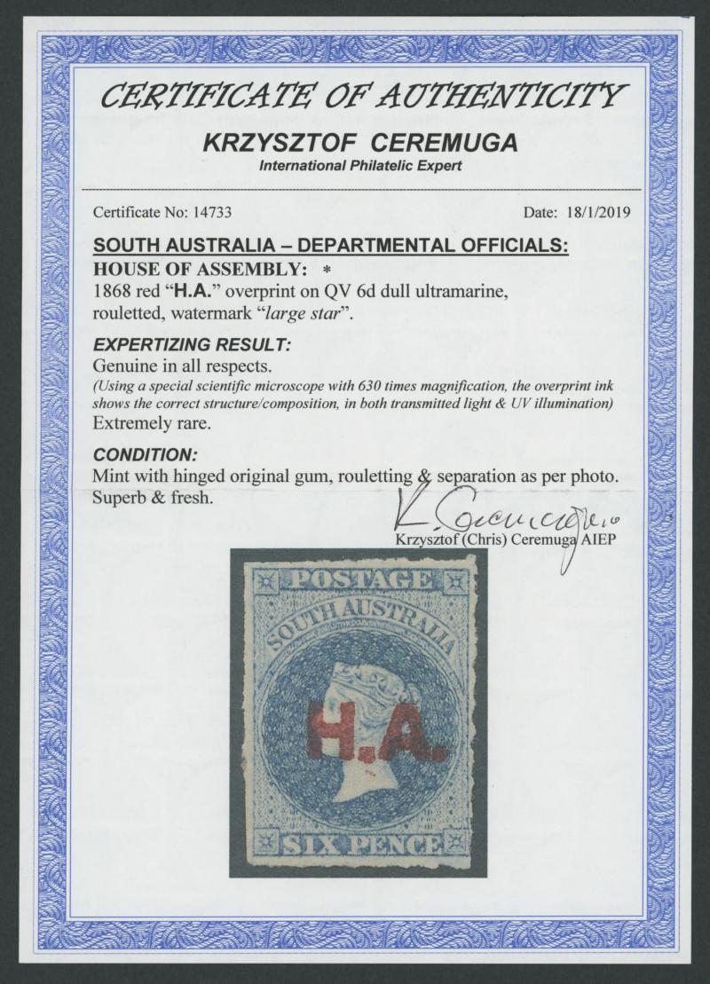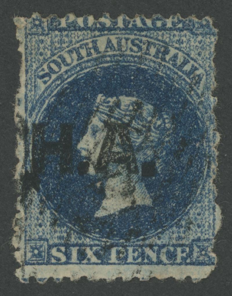 BLACK OVERPRINT: 'H.A.' on QV Perkins Bacon Large Star Wmk Perf 11½-12½ 6d Prussian blue SG 269, some irregular perfs at the sides,